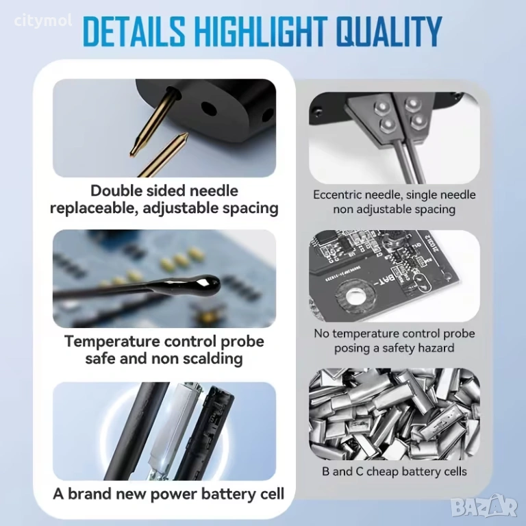 Заваръчният апарат е идеален за работа с различни видове цилиндрични батерии, като 18650/26650/36650, както и батерии за мобилни телефони или други електронни устройства, които изискват ремонт. Той е идеален за подмяна на повредени батерии, спестява пари и помага за опазване на околната среда чрез удължаване живота на електронните устройства.