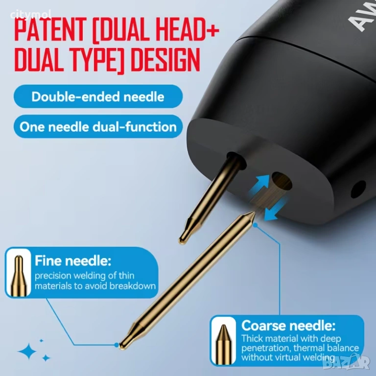 Устройството е оборудвано само с два бутона и ясен ярък LCD дисплей, на който може да се регулират всички фукции и параметри, което го прави много лесно за използване. Той предлага 11 регулируеми нива на мощност, адаптивни в зависимост от материалите, които заварявате. Например: