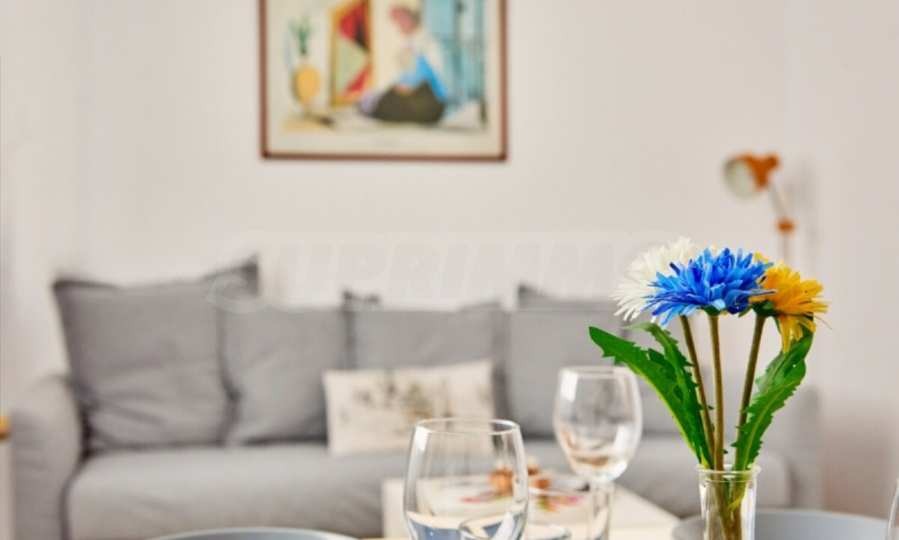 Жилището разполага с две самостоятелни спални, обзаведени с удобни легла и достатъчно пространство за съхранение. Просторният хол е съчетан с модерна и напълно оборудвана кухня, включваща всички необходими електроуреди за едно домакинство - хладилник, фурна, котлони, аспиратор и съдомиялна машина. В дневната зона ще откриете уютна мека мебел и телевизор, създаващи идеална атмосфера за почивка и развлечения. За допълнително удобство на наемателите е осигурена пералня със сушилня. Банята с тоалетна е стилно завършена и функционално оборудвана. Имотът разполага и с два балкона, които предоставят възможност за отдих на открито и допълнителна светлина в помещенията.
