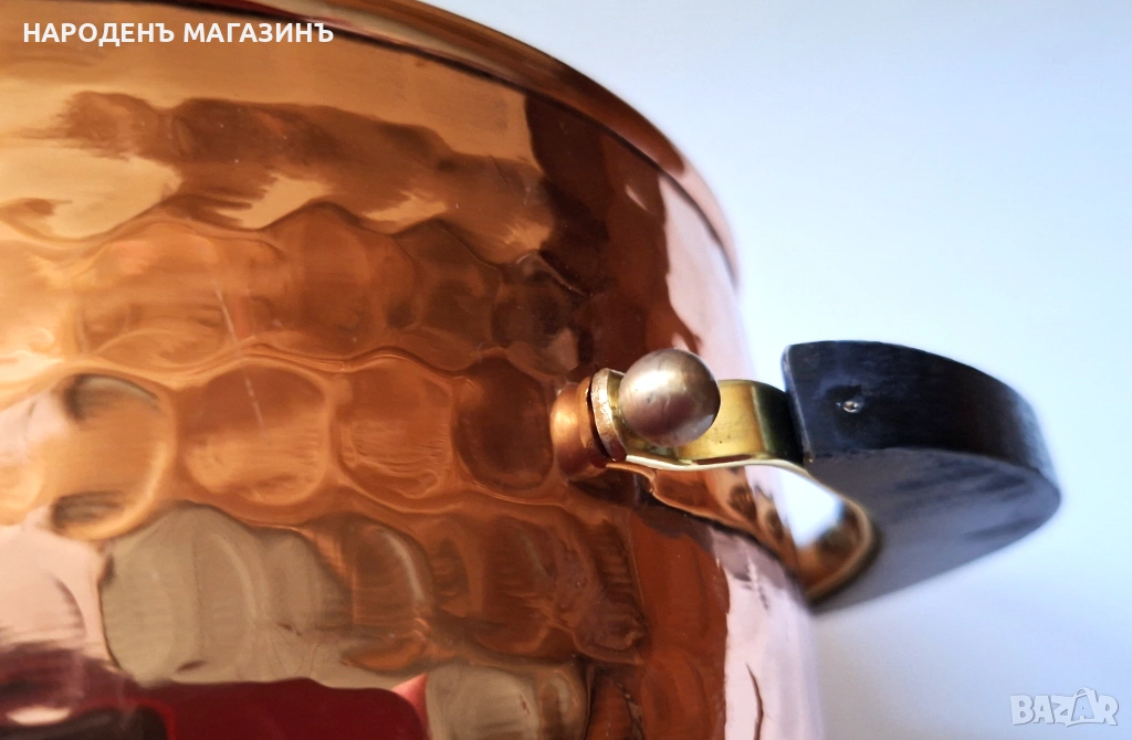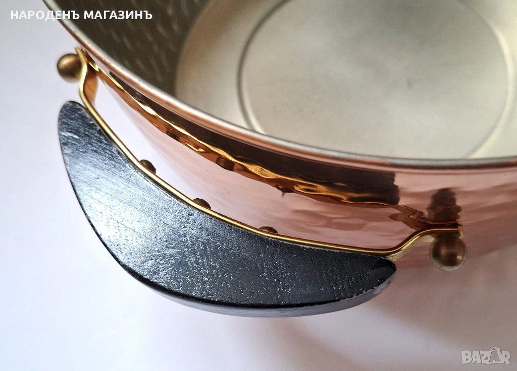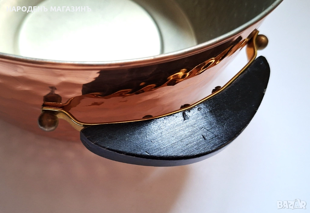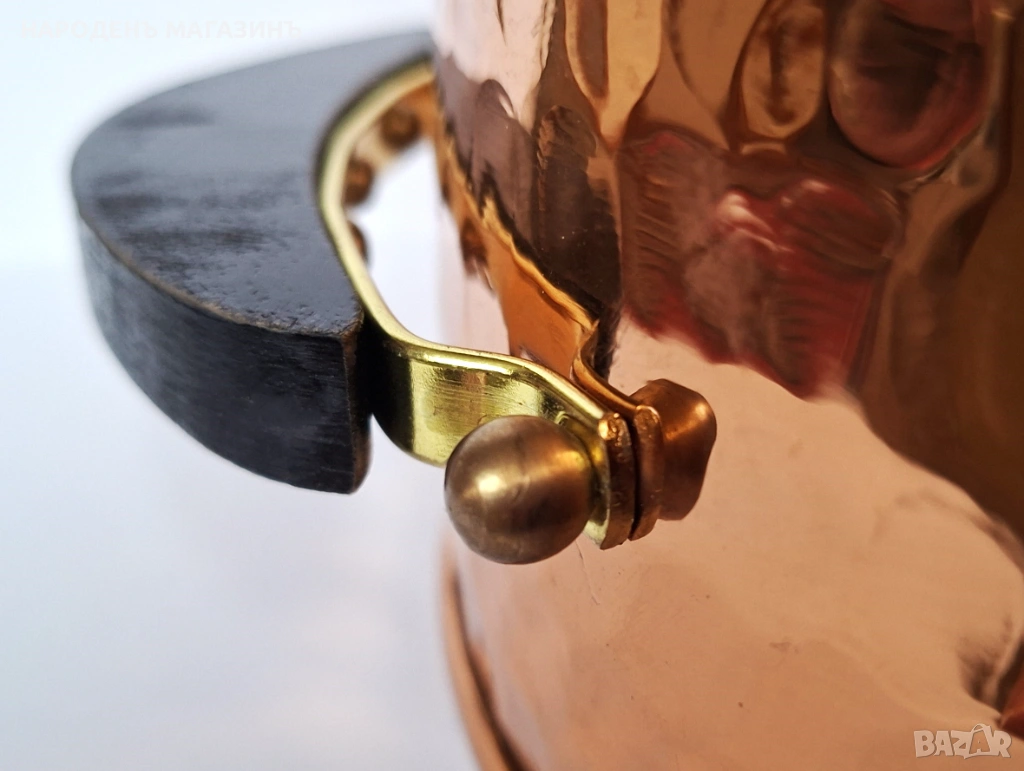 Релефна външна повърхност тип „пчелна пита“, фабрично калайдисана вътрешност, дървени дръжки с бронзови нитове тип „топка“.