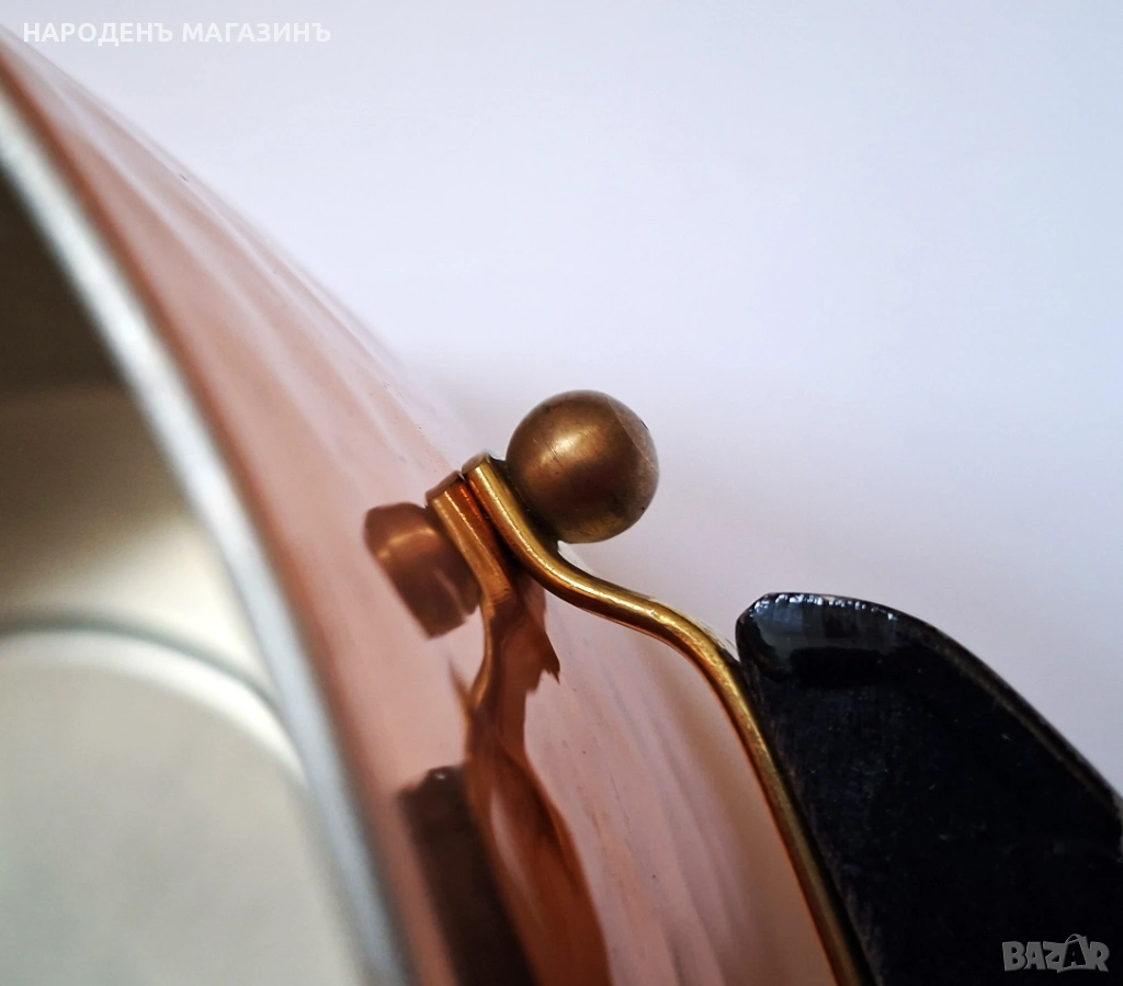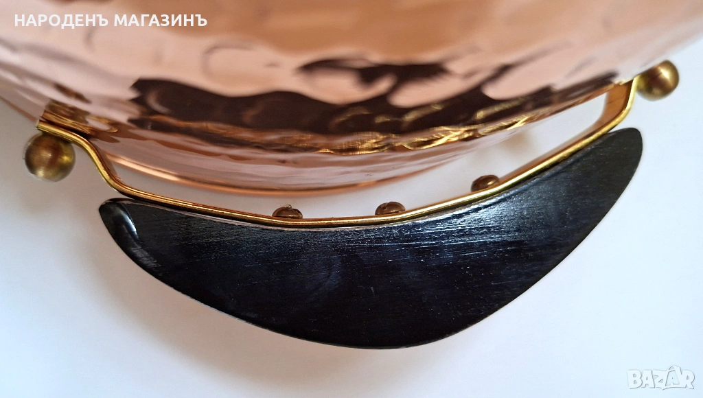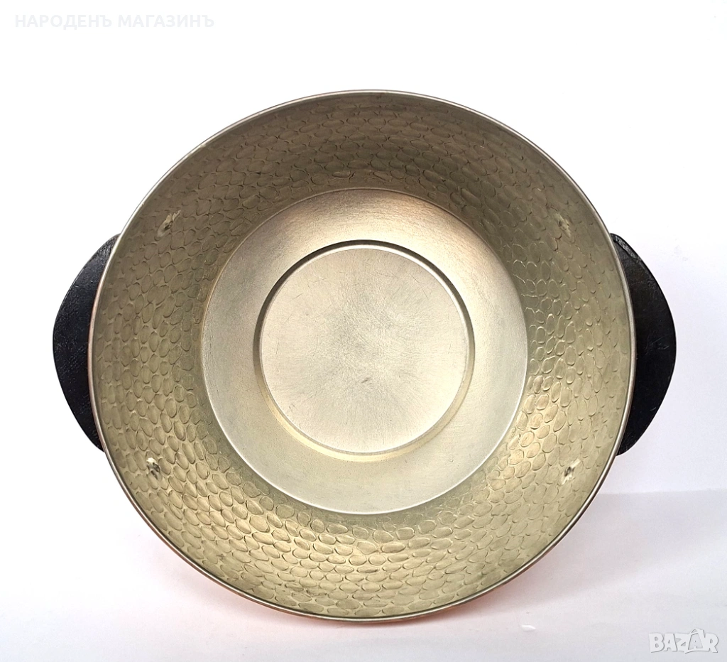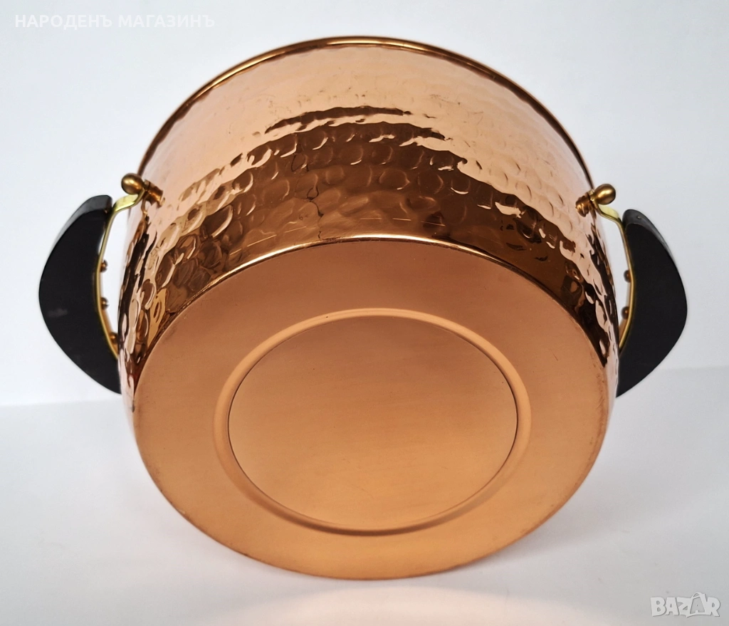 Релефна външна повърхност тип „пчелна пита“, фабрично калайдисана вътрешност, дървени дръжки с бронзови нитове тип „топка“.