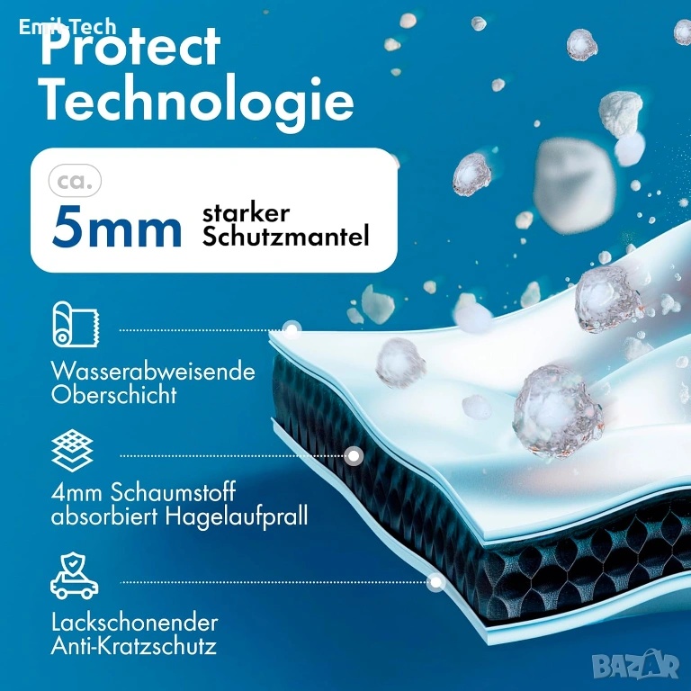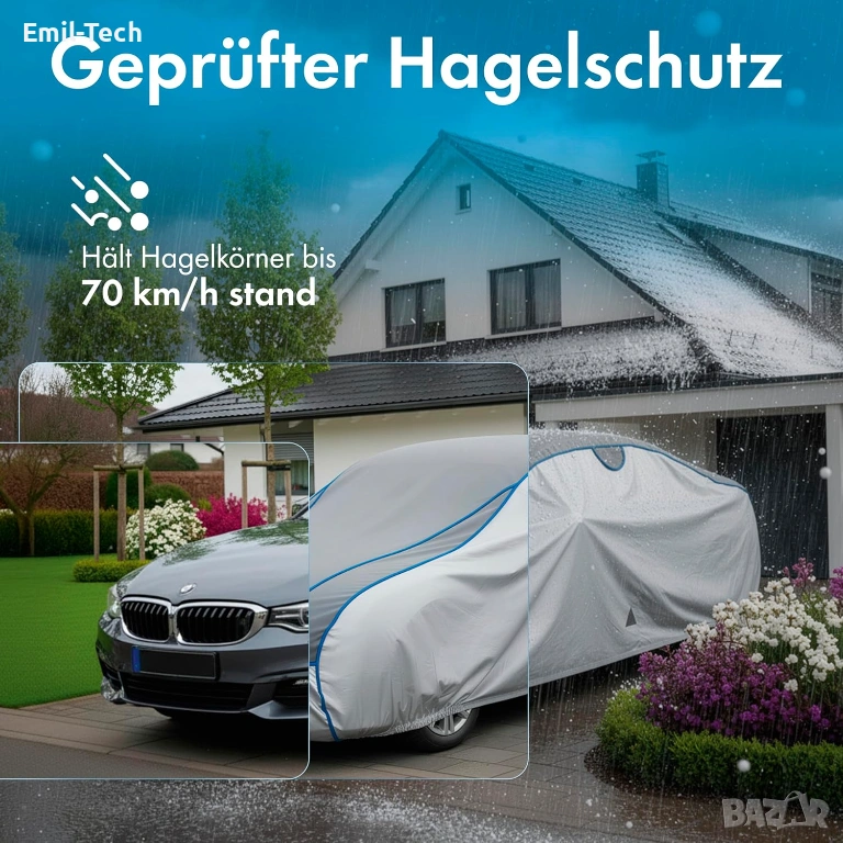 Покривало за автомобили против градушка, изработено от здрав и водоотблъскващ материал, подсилен с 4 мм защитен слой. Благодарение на своята многослойна структура, покривалото осигурява надеждна защита при градушка, дъжд, прах и силно слънце.