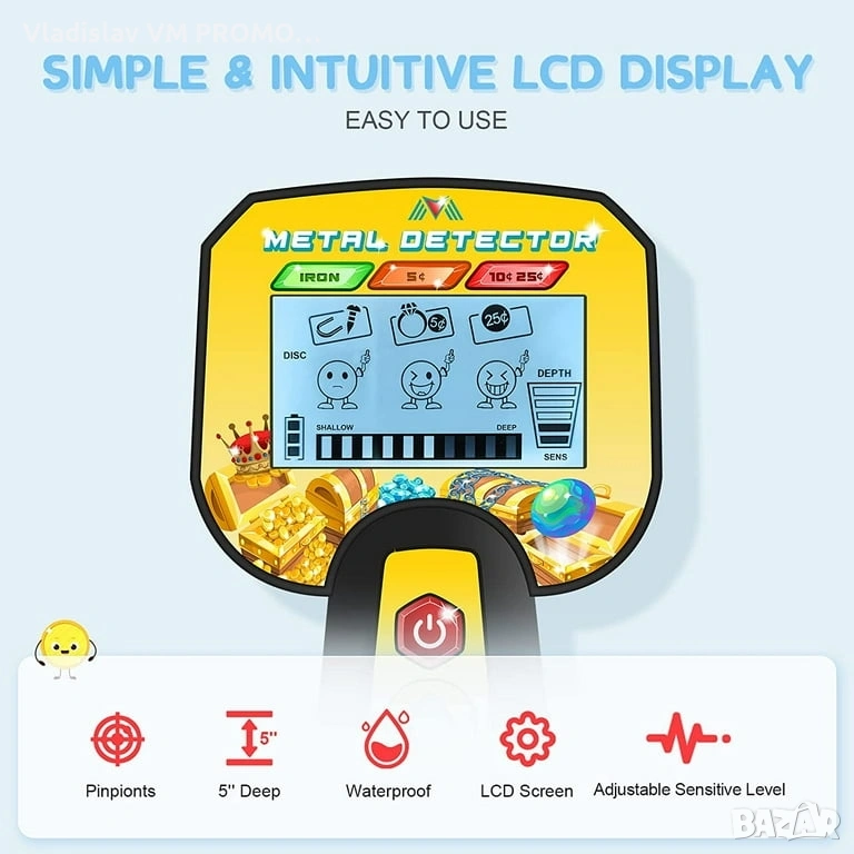 Водоустойчива бобина: 7,5-инчовата търсеща бобина е водоустойчива и може да открива цели с размер на монета до 5 инча дълбочина, идеална за приключения на открито.