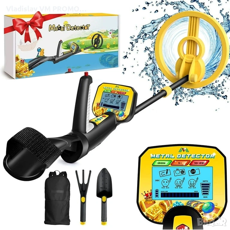 Пълен комплект: Предлага се с пръчка за металотърсач, 2 алкални батерии, раница, детска лопата, детско гребло, цветна кутия и ръководство за употреба.