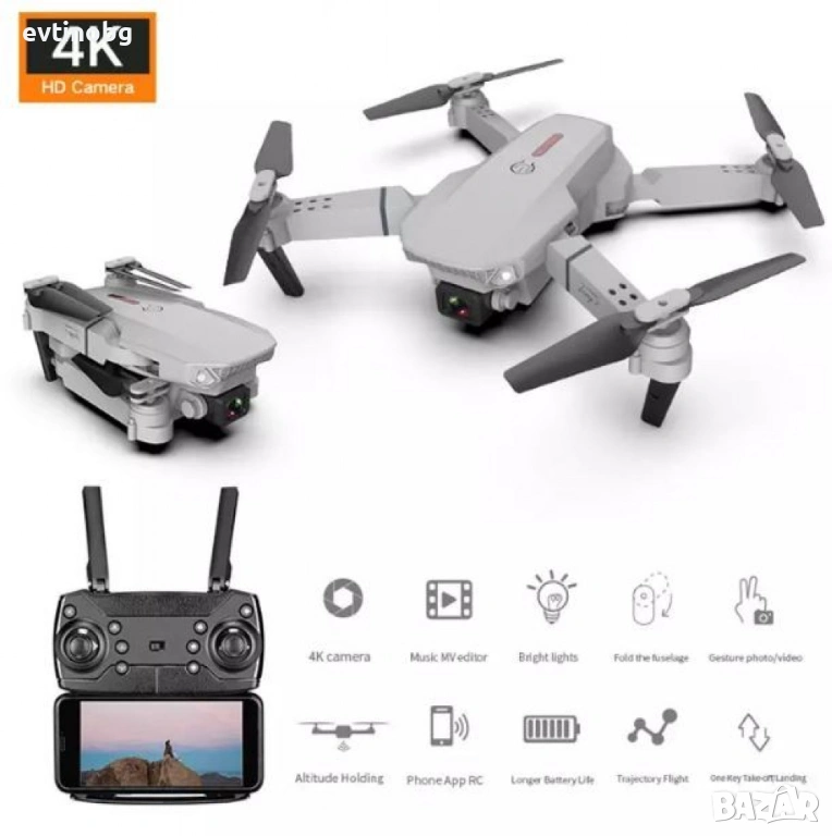 Дрон, 4k HD двойна камера/ Технически характеристики: Тип продукт: Дрон; Маневреност: Въздух; Захранване: Акумулатор; Състояние: Сглобен; Материал: Пластмаса; Цвят: Сив; Операционна система: Android, iOS; Свързаност: Wi-Fi; Тип акумулатор: Йонно - литиева батерия, 3.7V 540 mAh; Максимална дистанция: 150 м; Автономия при полет: 12 мин; Видео резолюция: Full HD, 4К; Поддържащи устройства: Смартфон; Работна честота: 2.4 GHz; Дистанционно: Да; Батерия на дистанционното: 3х АА, 1.5V; Функции: Автоматично кацане, Автоматично издигане, Сгъваем; Лесен за съхранение; Лесен за управление; Чиста и ясна картина със страхотни изображения; Размери: Разгънат: 25х25 см, Сгън: 12.5х 8.1 см.