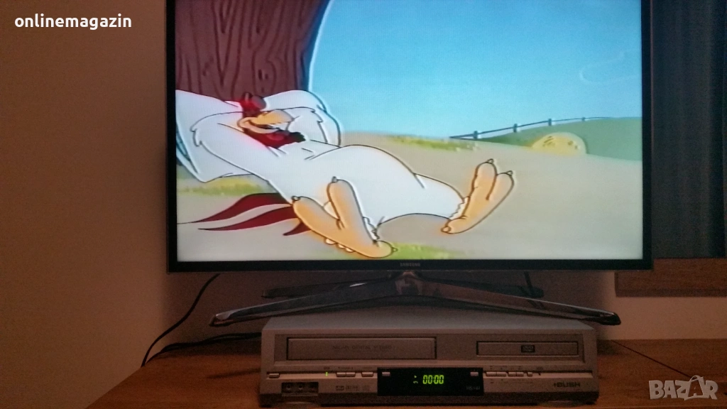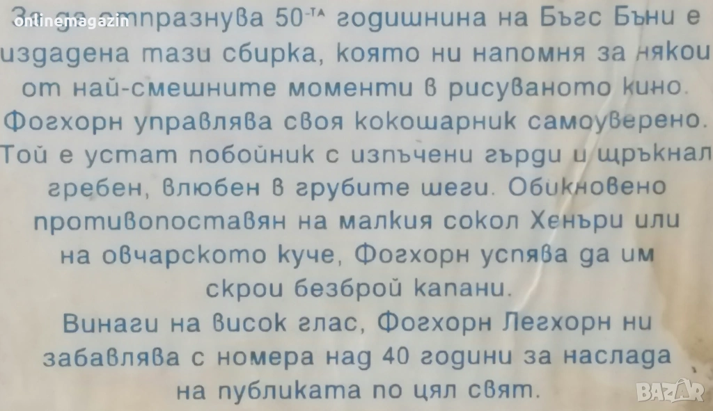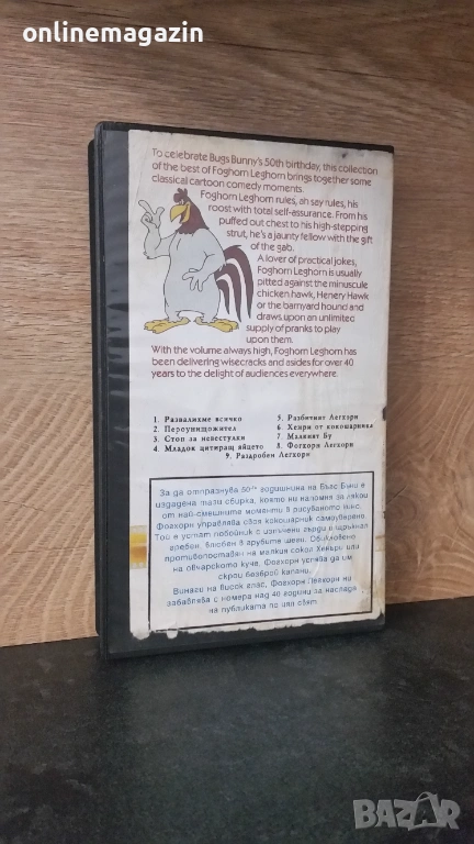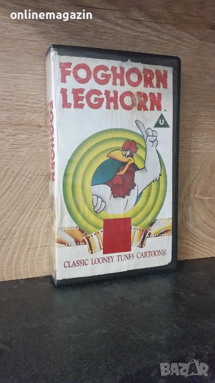 Продавам видеокасета "FOGHORN LEGHORN " Това е една от най-класическите анимации на Warner Bros . Той е шантав и заядлив петел. Първита му поява е през 1946 година . Касетата е озвучена на български език и работи отлично. 4 снимки на касетата в работещо състояние. Изпращам с Еконт, Спиди или лично предаване за град Бургас.