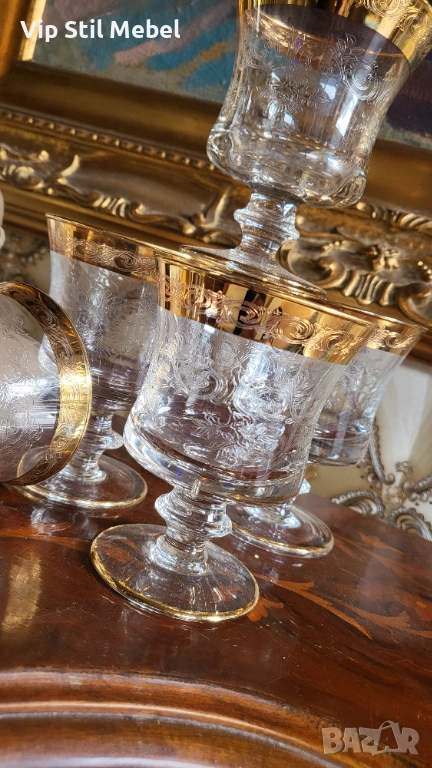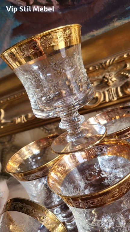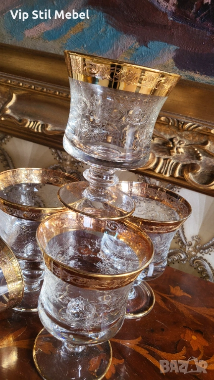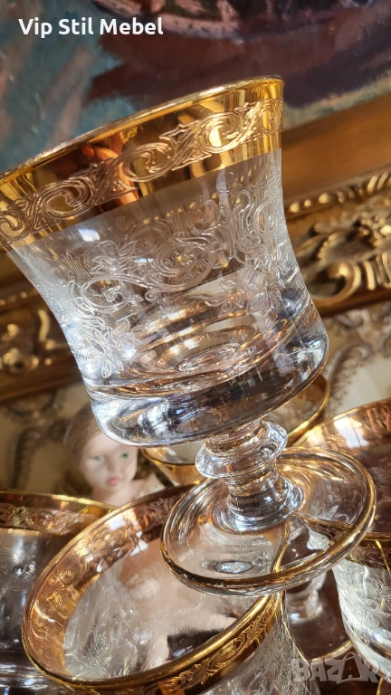 Всяка чаша е ръчно изработена, богато гравирана и украсена с плътен кант от 24K злато.