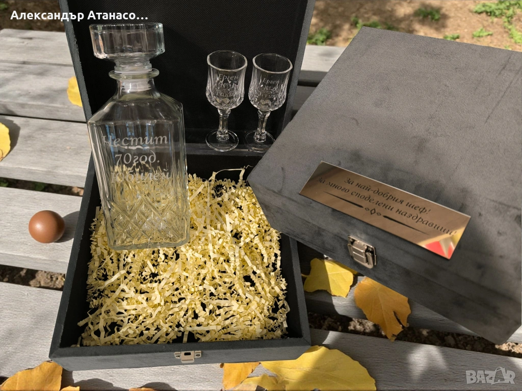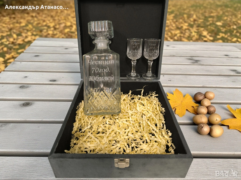 Персонализиран сет от Стилна гарафа + Две чаши за ракия + Подаръчна кутия → Обява 54082978