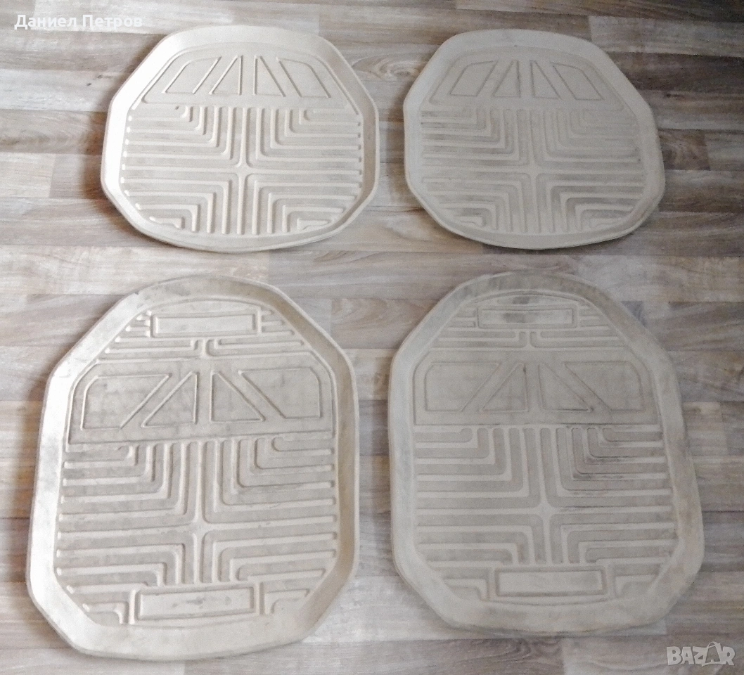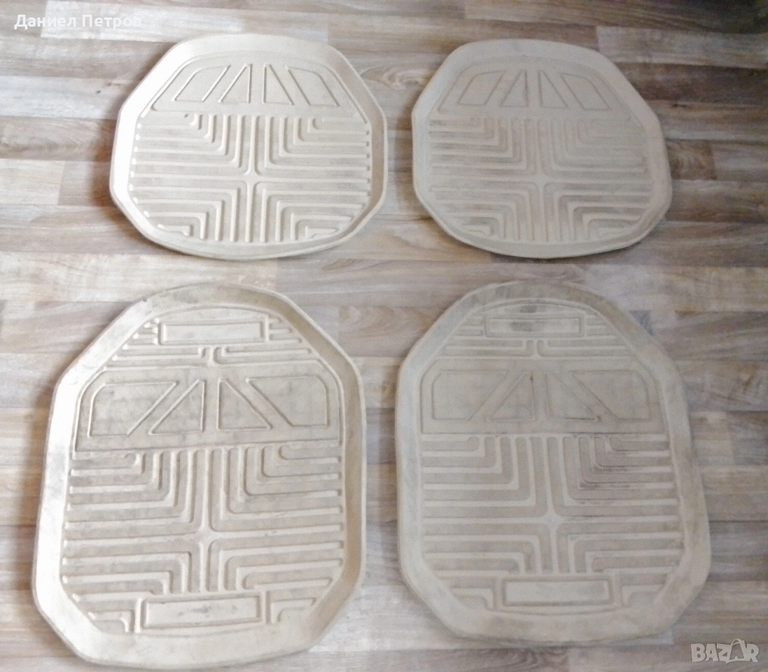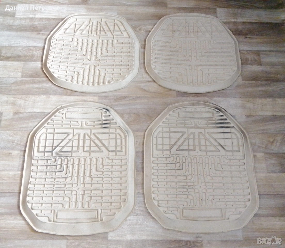 Бежови универсални стелки за кола, изрязани. Приблизителни размери- предни 54×44см., задни 44×44см. Стелките са без забележки, като изключим факта че са леко зацапани, нормално предвид цвета.