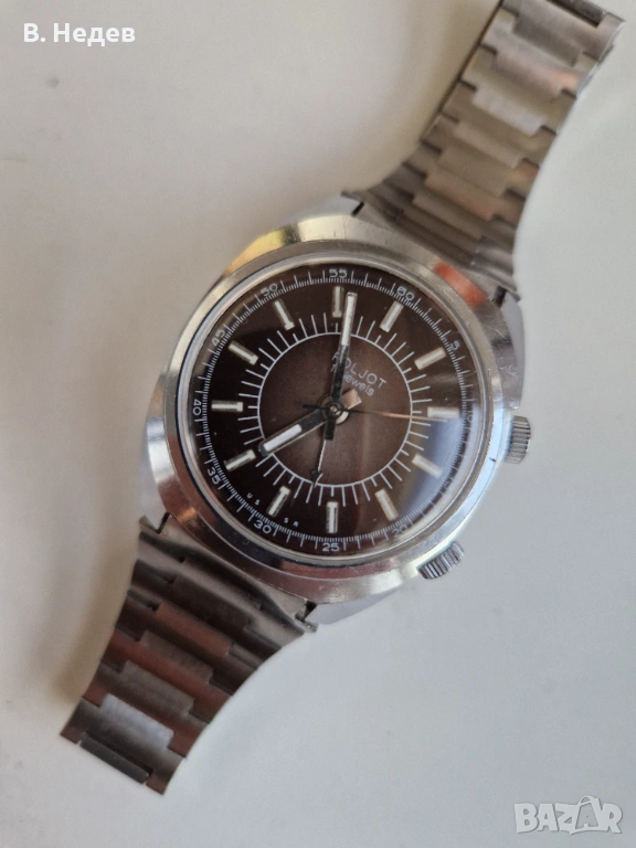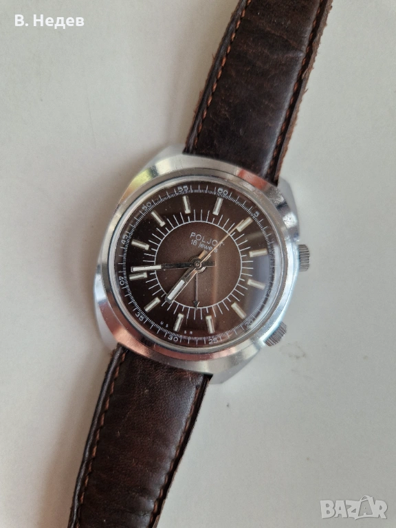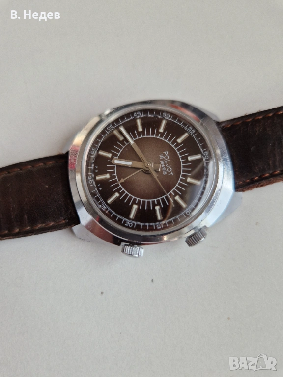 Продаваме този сравнително идеално запазен руски /съветски/ часовник - Полет - звънец. Ръчно навиване, отлично състояние - циферблат, индекси, стрелки, машина - моля разгледайте подробно снимките! Касата е с леки следи от годините /само по ръбчетата; обратната страна на касата! Часовника е с качествена машина - калибър 2612.1, със 18 рубинови камъка, противоударен прецизен баланс, централна секундарна стрелка, амортисиори на баланса и анкъра. Надеждна и безотказна машина. Вибрации на баланса - 18000/час. Часовникът поддържа точно време за механичен часовник – откл. до +1 мин./ 24 h. Запас на хода - около 39- 40 часа. Надписите върху циферблата: POLJOT, 18 jewels, made in USSR.
