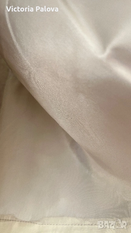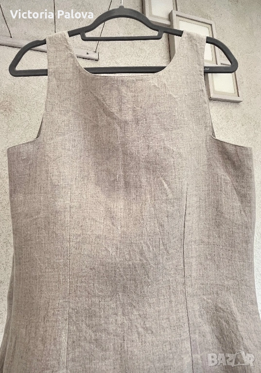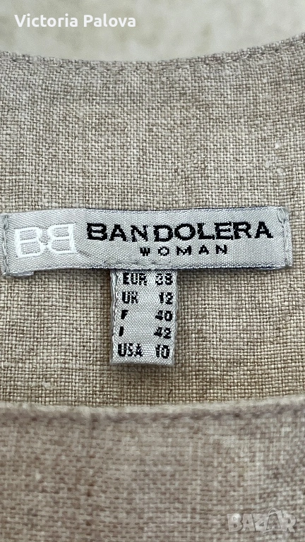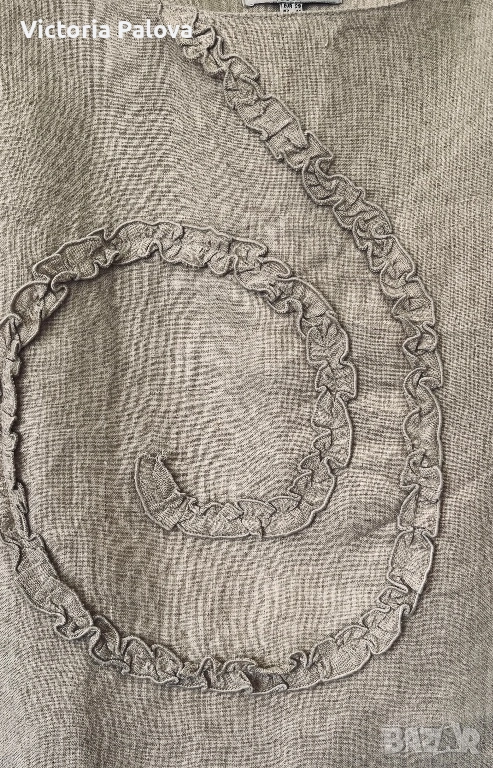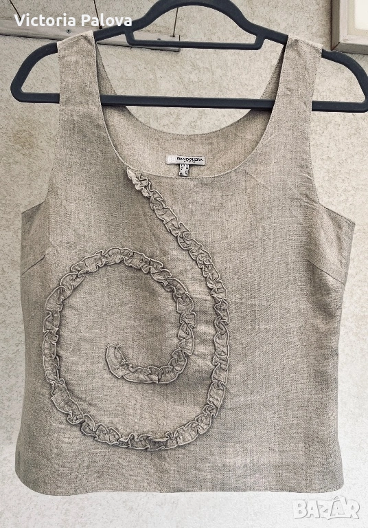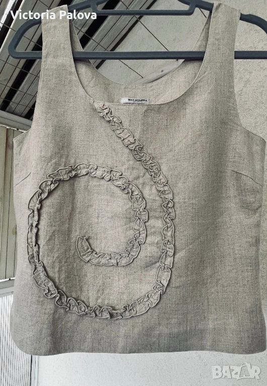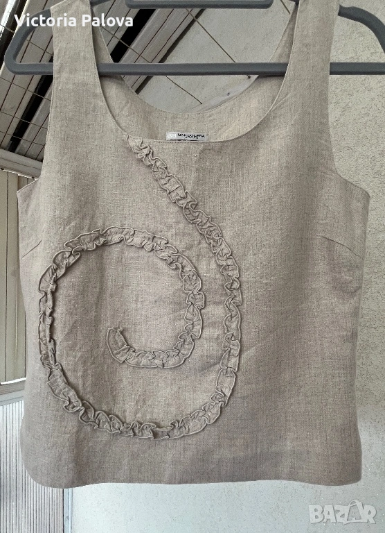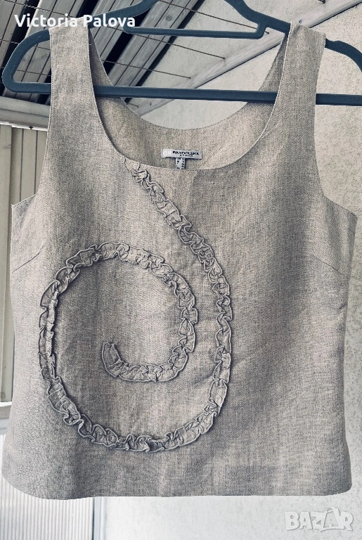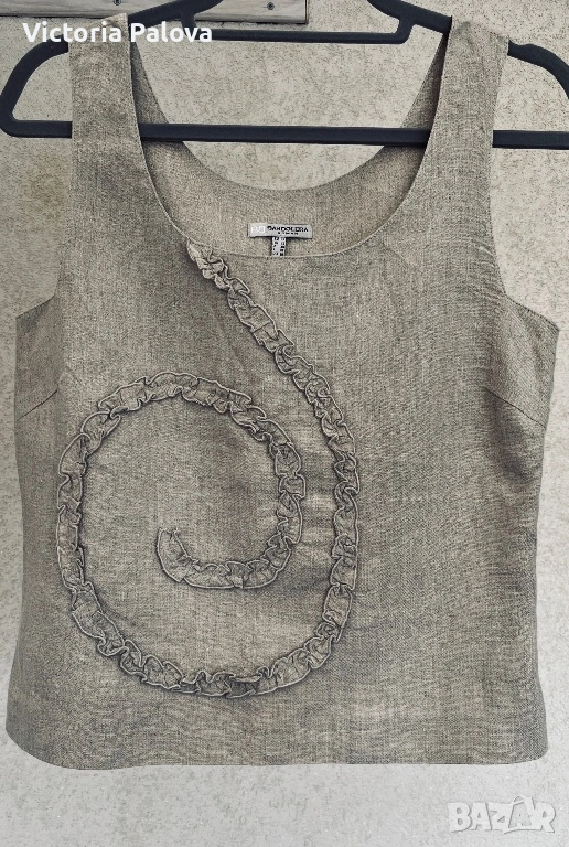Красив неизползван елегантен дамски топ на престижната холандска марка Bandolera. Моделът е истинска находка за ценителите на естествените материи и индивидуалния стил. Изработен от висококачествен лен в натурален бежов цвят, той съчетава класическа визия с модерен, артистичен акцент под формата на спирала от нежни рюшове. За постигане на перфектна структура и плътност изделието е частично подплатено, а за максимално удобство при обличане е добавен дискретен страничен цип.Топът се отличава с прецизни пропорции, включващи ГО 45см, дължина от 54 см, ширина при талията 40 см и долен край от 43-44 см. Благодарение на естествената материя и стабилните презрамки, моделът осигурява изключителен комфорт и прохлада, което го прави идеален избор за изграждане на стилна и устойчива лятна визия. Съчетава се прекрасно както с деним за ежедневието, така и с официален панталон или пола за специални поводи. Стабилните презрамки гарантират комфорт и сигурност през целия ден.