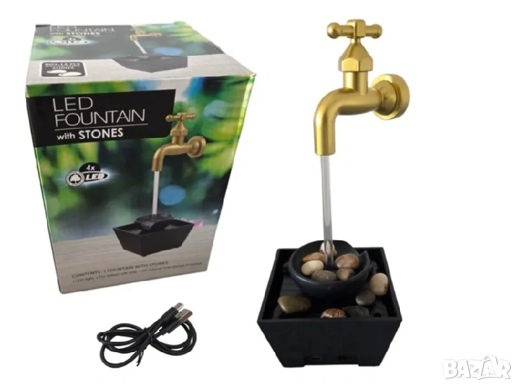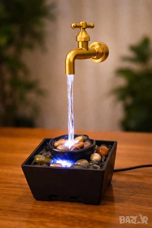 Този декоративен LED фонтан създава впечатляваща илюзия за „плаваща“ чешма, която излива вода в малко езерце с камъчета. Комбинацията от течаща вода и мека LED светлина създава релаксираща атмосфера и уют във всяко помещение.