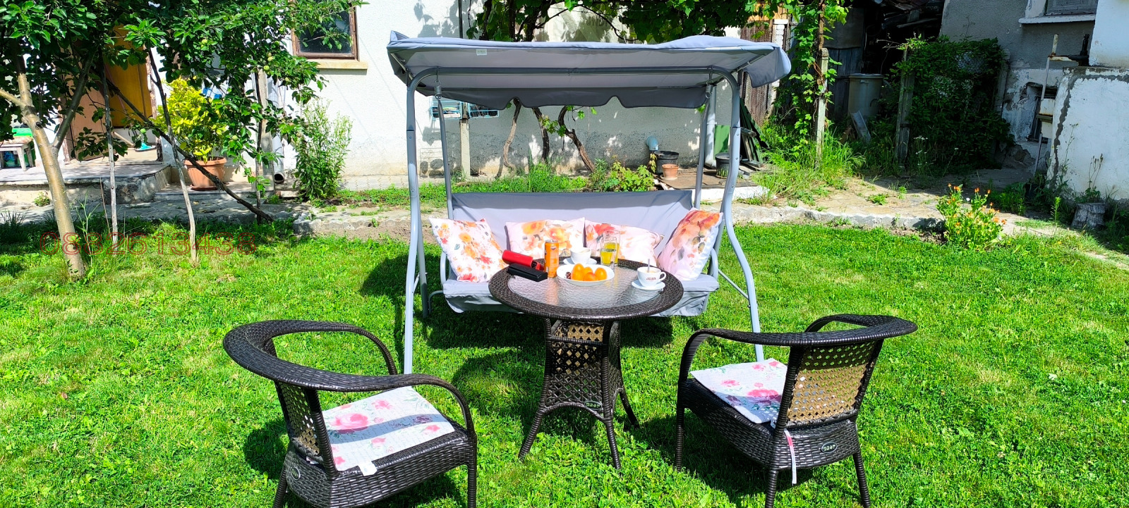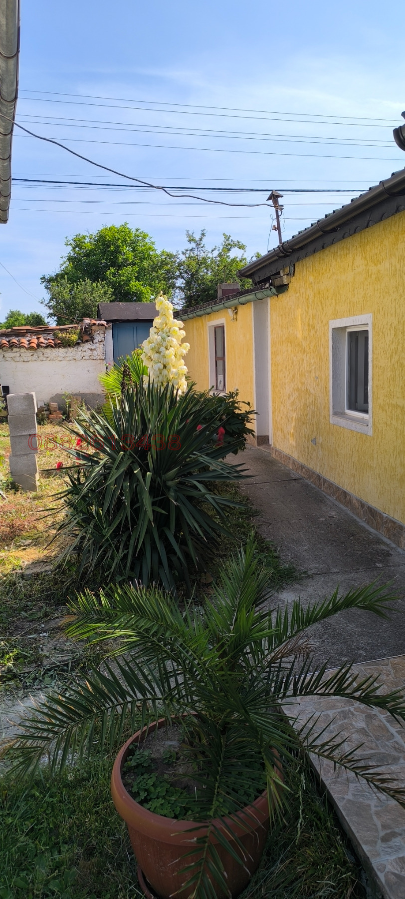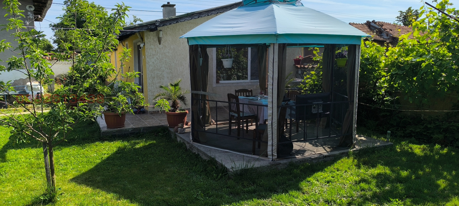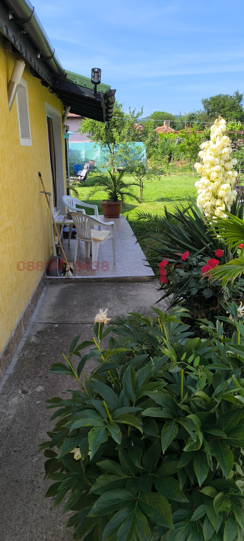 Към нея е залепен гараж 24 кв.м.от тухла и стомана бетон.Дворът е с южно изложение равен с правилна форма.Има много овощни дръвчета тревни площи и обработваема площ с парник,кокошарник и др.