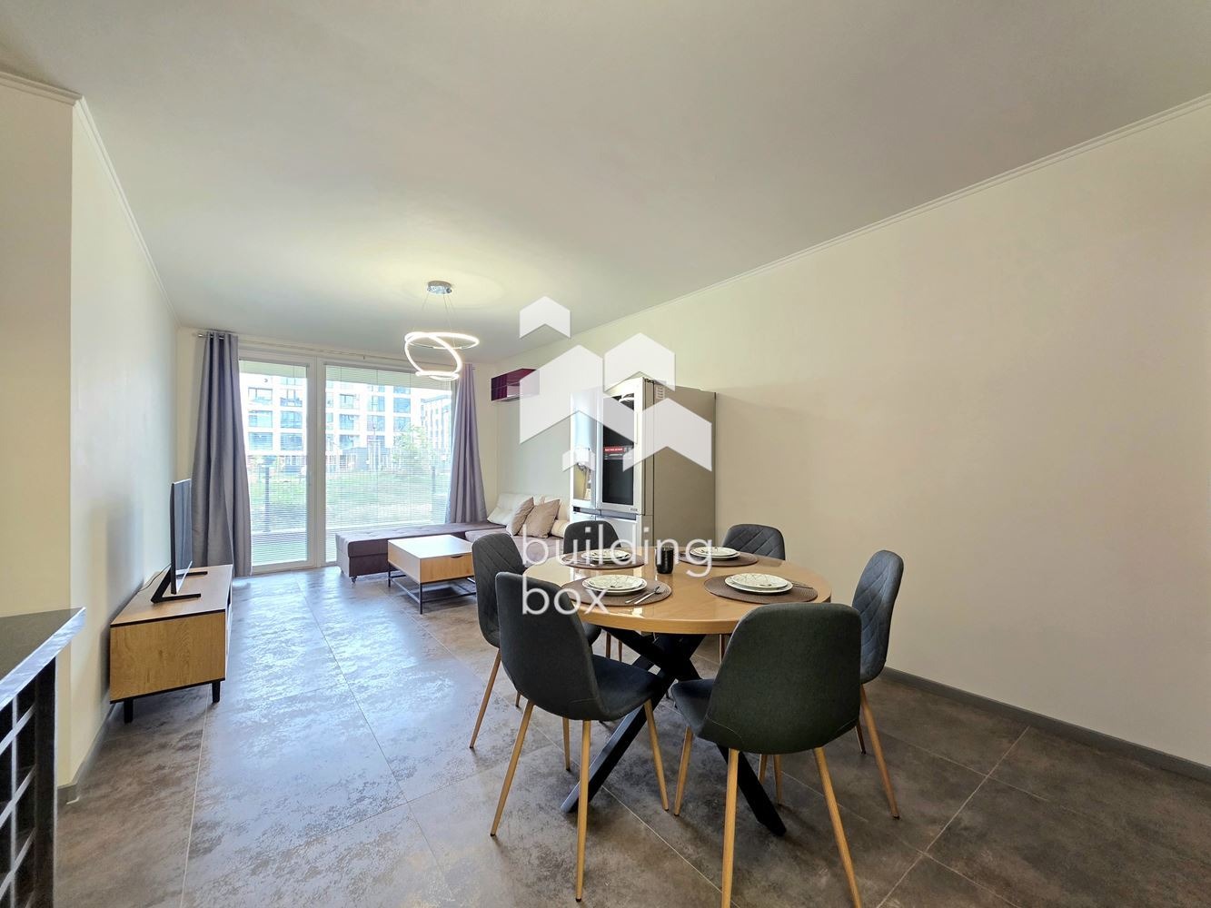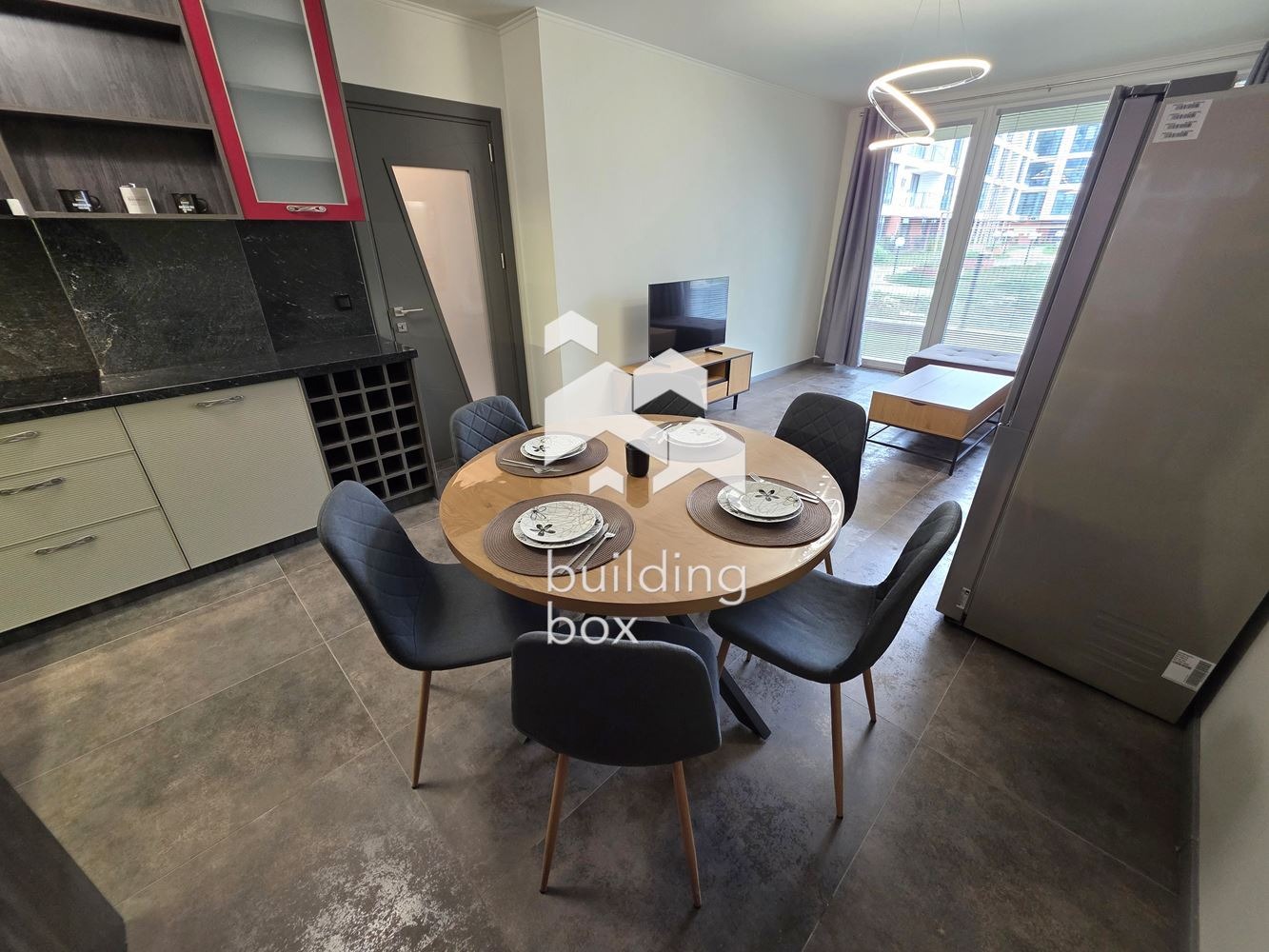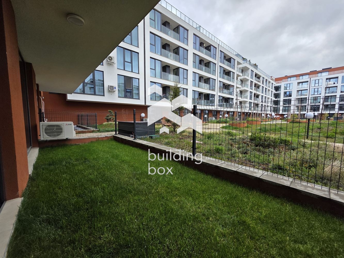 Билдинг Бокс предлага под наем двустаен, отлично завършен апартамент със собствен двор, находящ се в комплекс от затворен тип - Далия Резидънс.