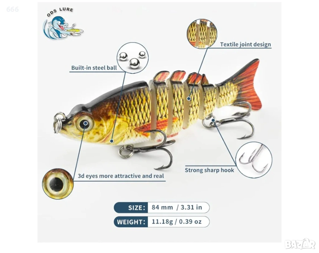Риболовната примамка е с дължина 84 мм и тегло около 11,18 г.