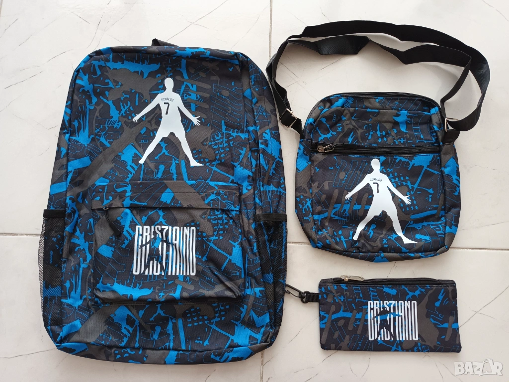 Продавм комплект от 3 части - нова ученическа раница, несесер и по-малка чанта с дълга дръжка на Кристиано Роналдо. Раницата има две отделения с цип (едно голямо и едно по-малко отпред), отделение за лаптоп и две отделения отстрани за вода и чадър.
