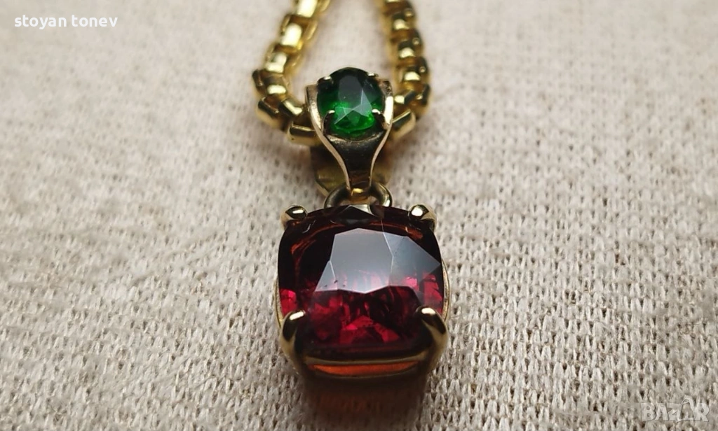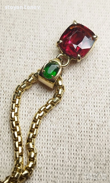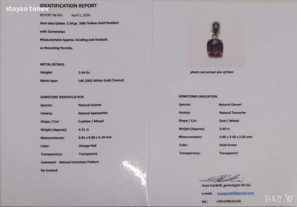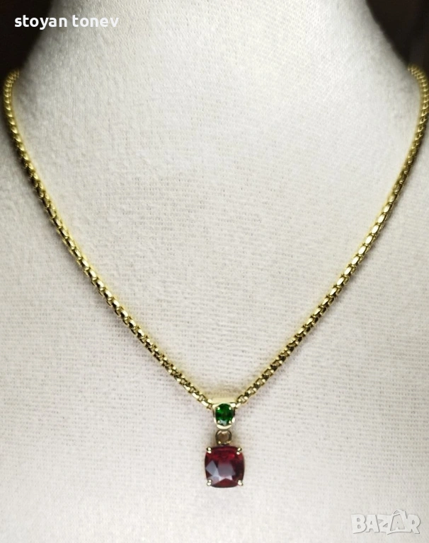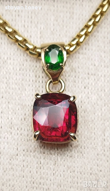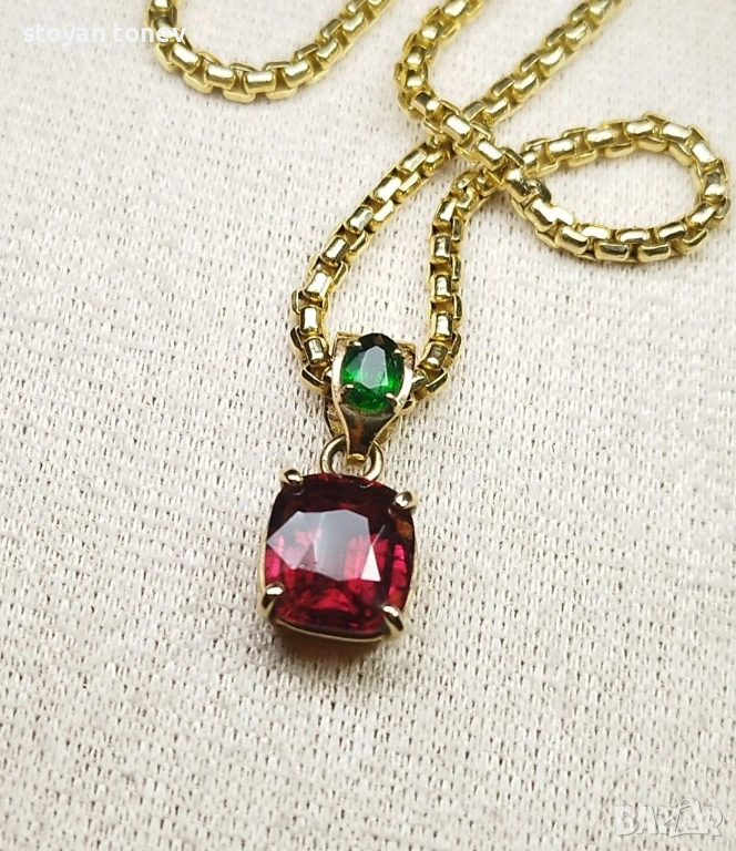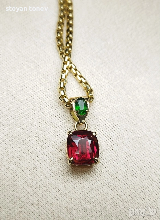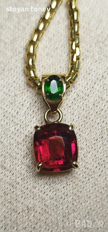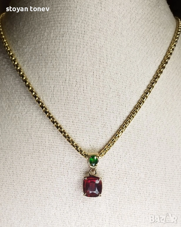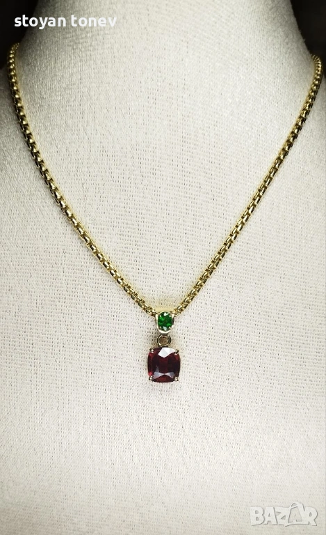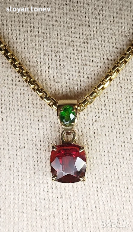 - Злато и дизайн: Ръчно изработен по мой авторски дизайн от 14K масивно злато (тегло на медальона 2.64 гр.). Елегантна и балансирана композиция – големият cushion спесартин е центърът на вниманието, а малкият цаворит отгоре добавя свежа, изумрудена нотка. Бижуто изглежда скъпо, женствено и едновременно модерно.