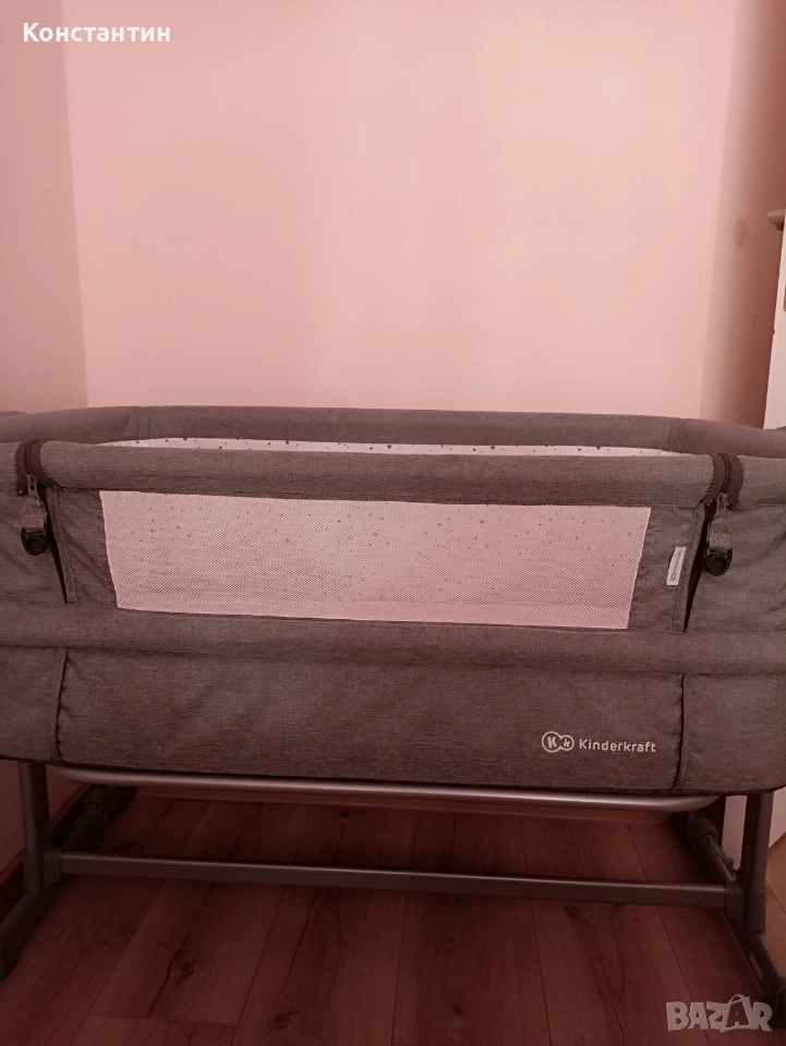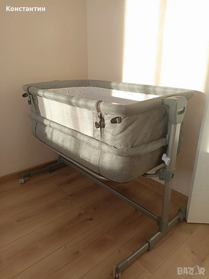 За да го поставите прикрепено за вашето легло, креватчето разполага с дълги колани, подходящи за различни видове легла. Освен това предната преграда на кошарата може да се сваля посредством ципове. По този начин вечер лесно ще виждате какво прави бебчето без дори да ставате от леглото.