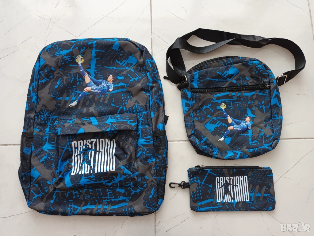 Продавм комплект от 3 части - нова ученическа раница, несесер и по-малка чанта с дълга дръжка на Кристиано Роналдо. Раницата има две отделения с цип (едно голямо и едно по-малко отпред), отделение за лаптоп и две отделения отстрани за вода и чадър.