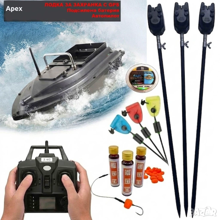 Лодка за Захранка с Точен GPS.Сигнализатори Обтегачи Swinger Колчета и Стойки.Атрактант за Риболов +