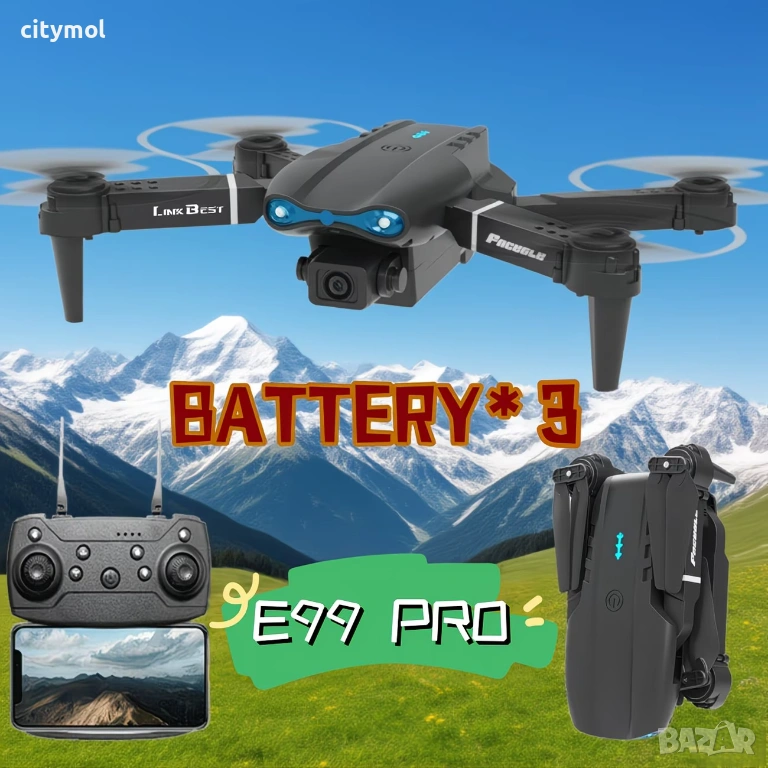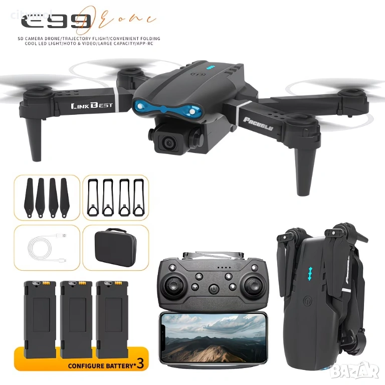 Дронът E99 Pro ви предлага невероятно летателно изживяване благодарение на най-добрите технологични характеристики: висококачествена 4K, HD камера, 3 броя 3,7 V /1800 mAh батерии, които ви осигурява 3х20-минутен полет, безчеткови двигатели, които осигуряват безопасен, ефективен полет с дълъг летеж, достигащ разстояния до 100 метра и предаване на изображения до 100 метра с летателното устройство.