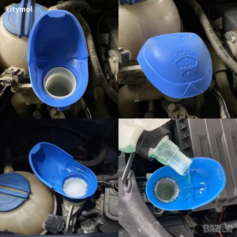 Фунията замества оригиналния пластмасов капак на резервоара за течност за миене, който понякога може да се затвори неочаквано, което затруднява пълненето на течност за миене.