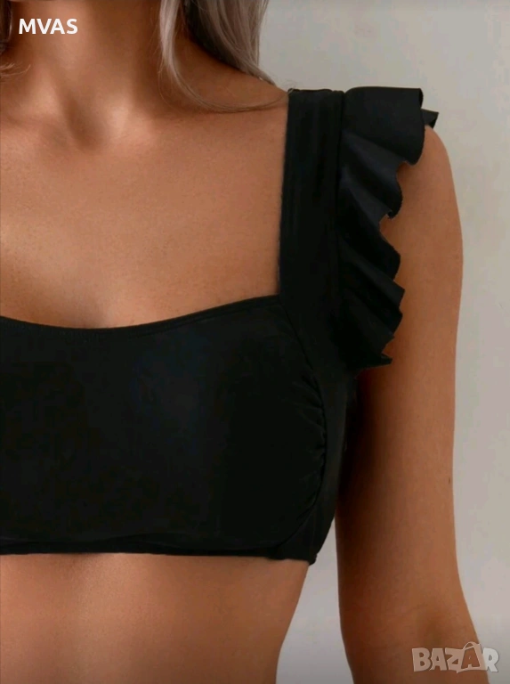 Горнище с ластични презрамки с волани, има подплънка, но не е дебела, мека е