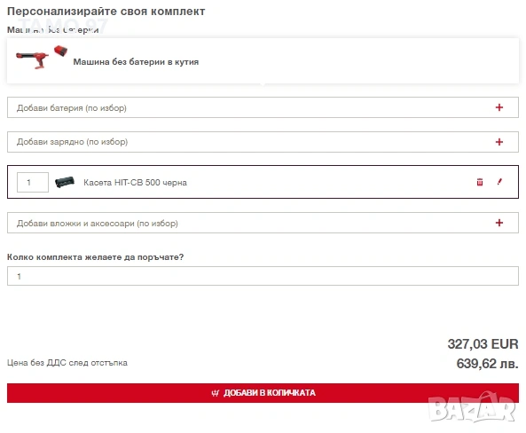 Продавам акумулаторен пистолет за двукомпонентно лепило на Хилти в отлично визуално състояние, както се вижда на снимките и работи перфектно, внос от Франция. Обявената цена включва акумулаторен дозиращ уред за монтаж, черна касета HiT-CB 500 без батерия и зарядно. При желание на клиента може да се окомплектова с 2 батерии и зарядно за 310евро. Пращаме с преглед и тест с куриерска фирма еконт може и лично предаване за гр. Шумен.