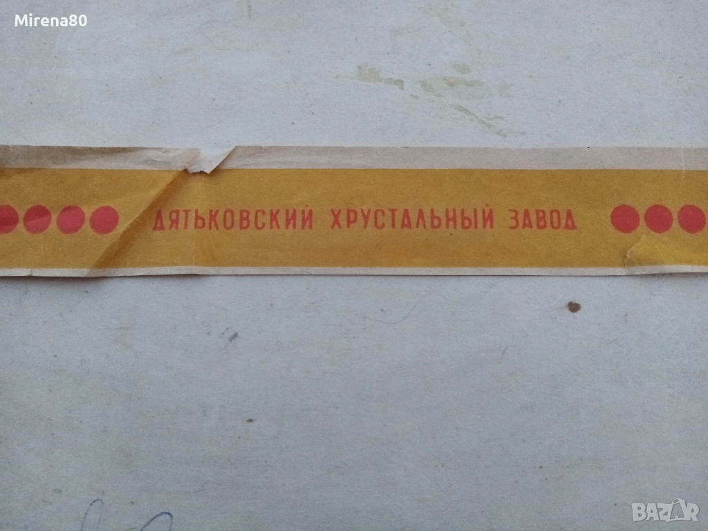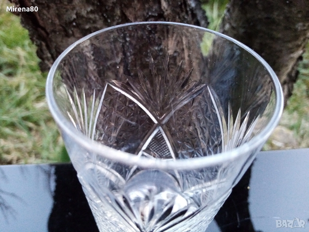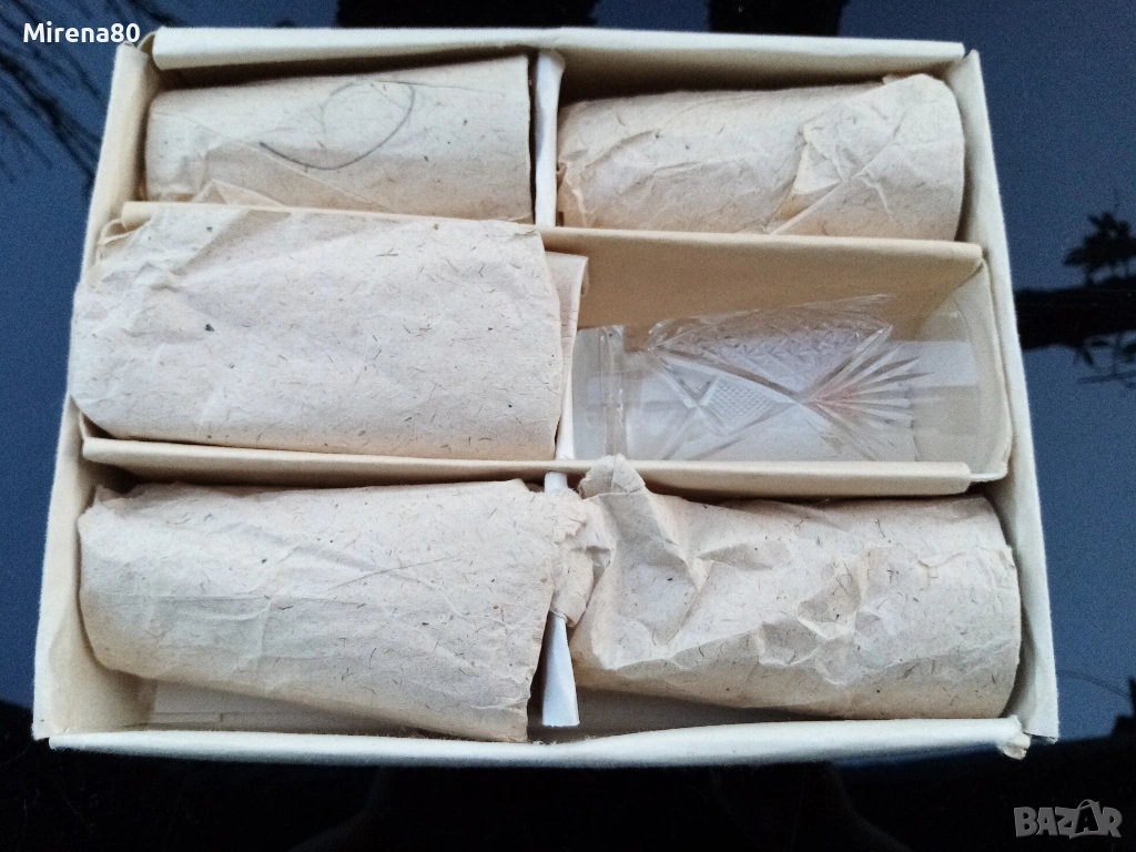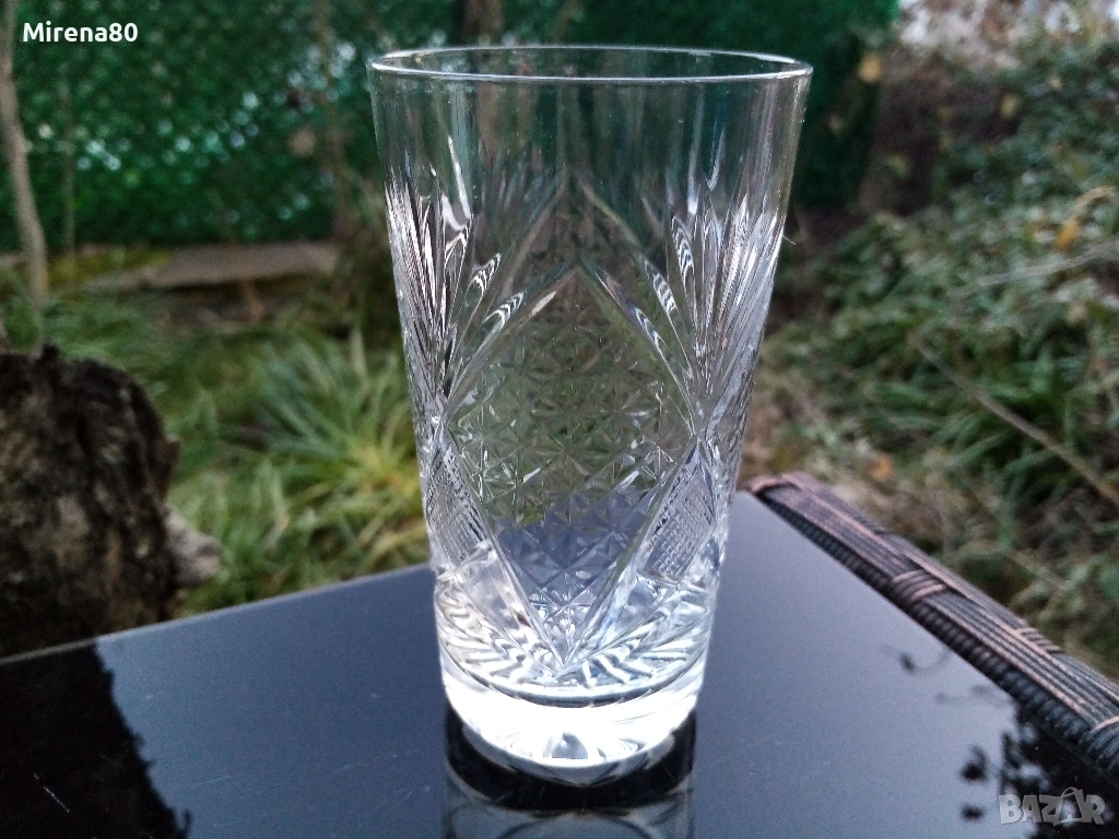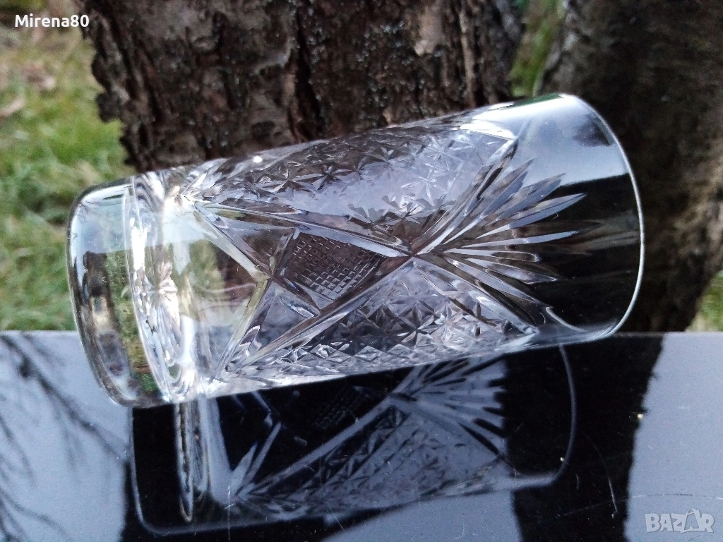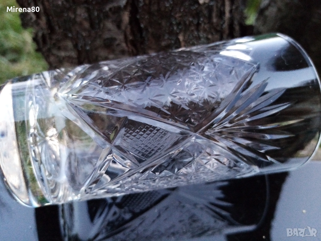 Руски оловен кристал - Дятьковский хрустален завод. Чашите са много красиви - богато гравирани и много бляскави. Вмест. 200 мл, вис. 11, диам. 6 см. Някои чаши са с по 2-3 мм по-високи от други - което е нормално при ръчното производство. Сервизът е нов, с етикети и оригинална кутия.