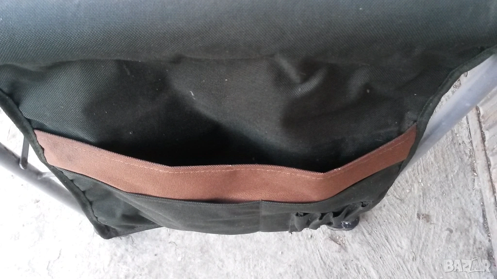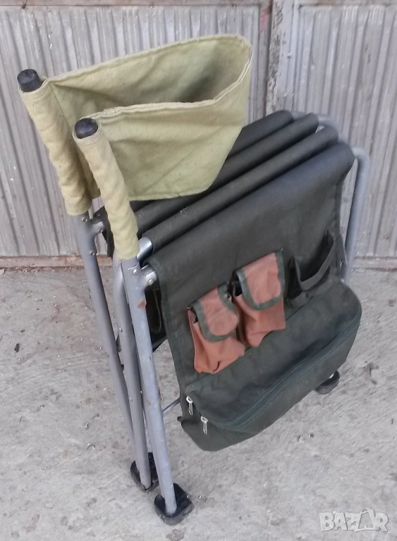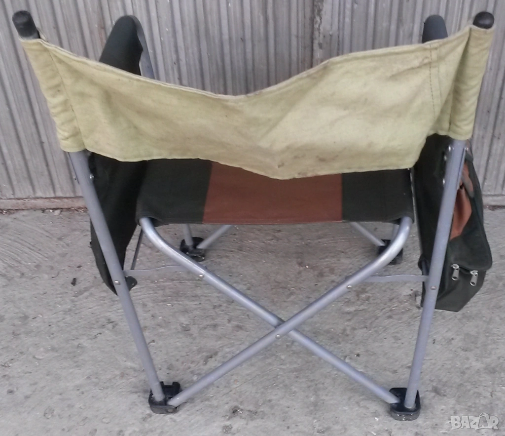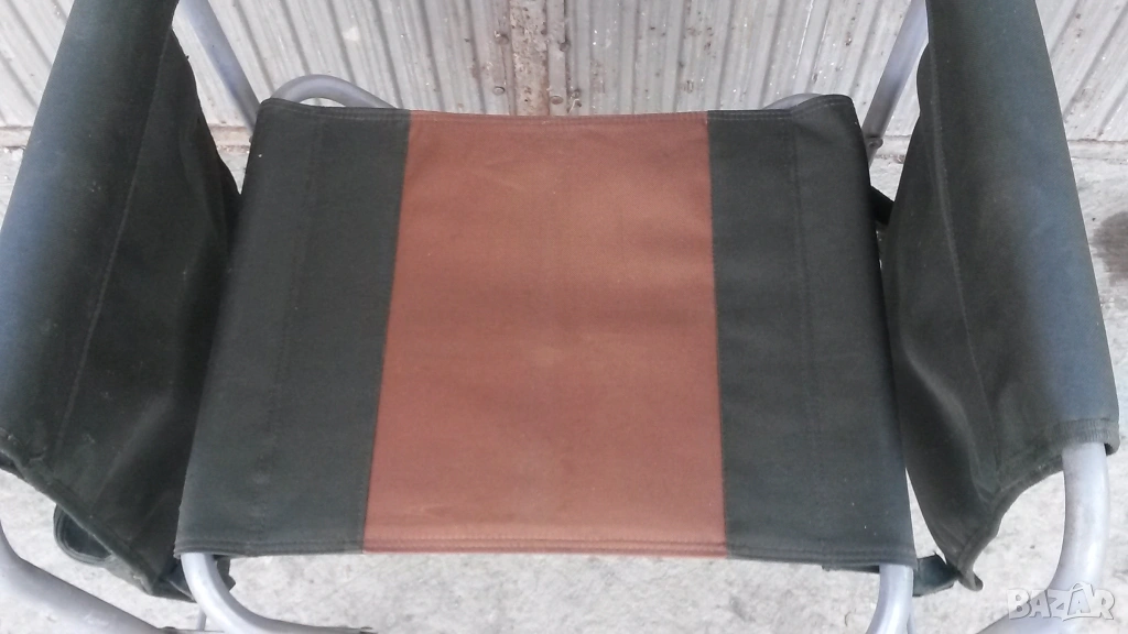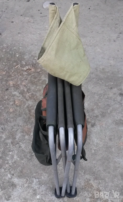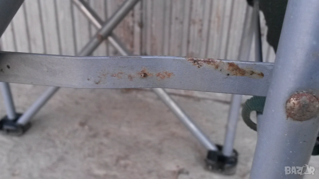 Платнените части на стола може да се изперат, защото са захабени и изцапани на места. Велкрото и ципът работят. Има малко ръжда по металните части. Като цяло е запазен.