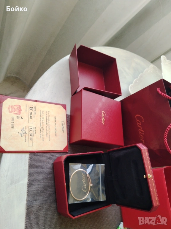 Златна 18-каратова 750 гривна Cartier 12,3 грама купувана лично от мен от Лондон,подарък за приятелката ми но за жалост и е малка..Гривната е размер 17..Цена на грам 80 евро с 10 по-малко от изкупната в TAVEX..Не съм я продал в TAVEX Илина някой златар или заложна къща поради простата причина,че ще я купят за материал а няма абсолютно никакъв смисъл да се разваля това нежно и красиво бижу,което е и с висококачествени цирконий наричани още ;ДИАМАНТ;- ,МАТАРА,..Гривната идва пълен комплект и сертификат!