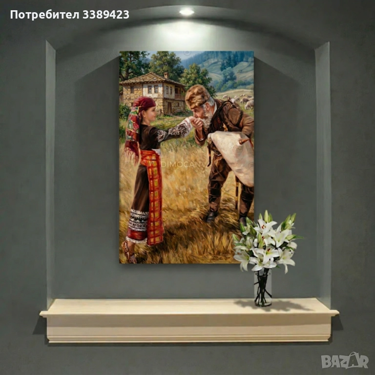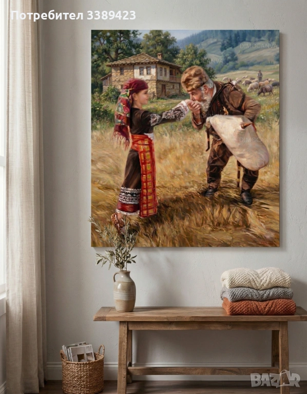 Търсите оригинален и стойностен подарък, носещ магията на българския бит и любов? Тази висококачествена картина върху канава, изобразяваща гайдар, целуващ момиче по ръката, е символ на обич, уважение и чиста традиция. Изключително подходяща за сватбен подарък, юбилей, нов дом или за всеки, който цени българския фолклор и автентичните моменти.