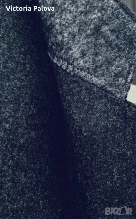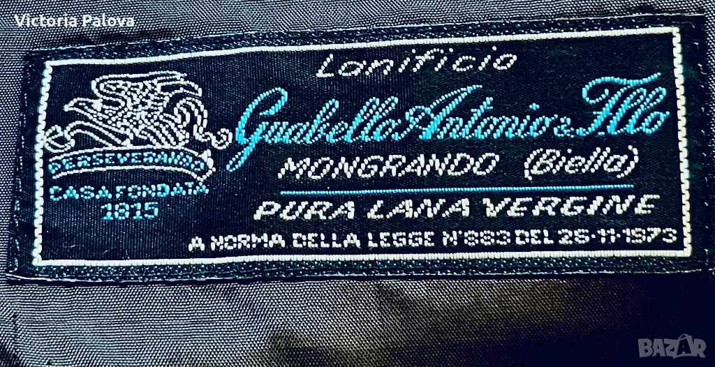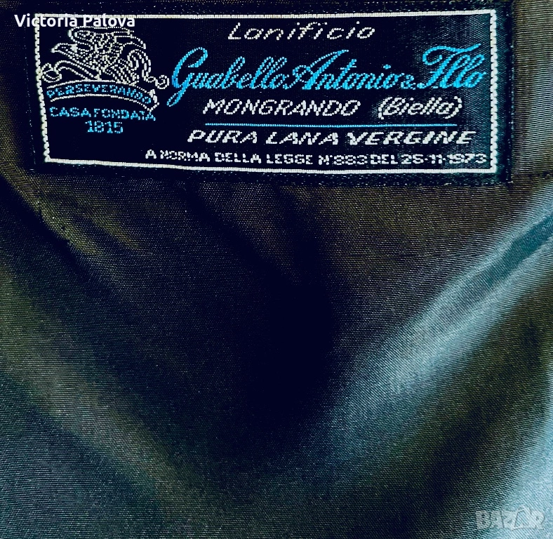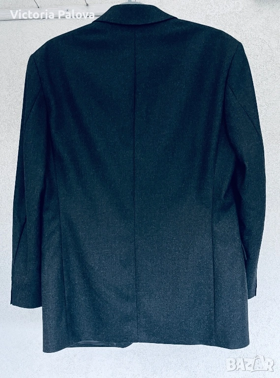 Неизползвано мъжко сако от 100% чиста нова вълна (pura lana vergine) на престижната италианска тъкачница Guabello - един от най-уважаваните производители на висококачествени вълнени платове в света, известен с изключителната мекота, плътност, еластичност и дълготрайност на материалите си. Тъканта е меланжова с фина и равномерна текстура в наситен тъмносив цвят, който изглежда дискретен, солиден и много лесен за комбиниране.