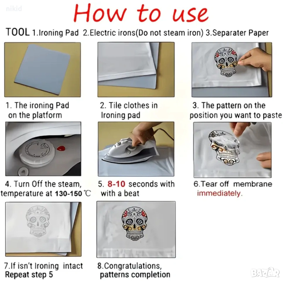 Поставете върху желана дреха -БЕЗ да премахвате защитно фолио , покрийте с парче плат,след което с топла ютия 120-150 градуса за 10-15 секунди минете отгоре ,след което отлепете защитното фолио.