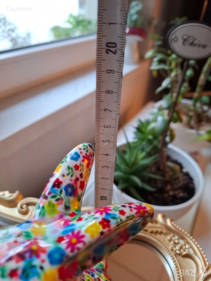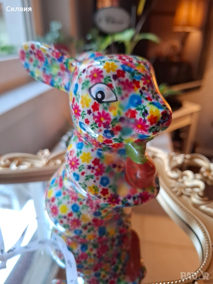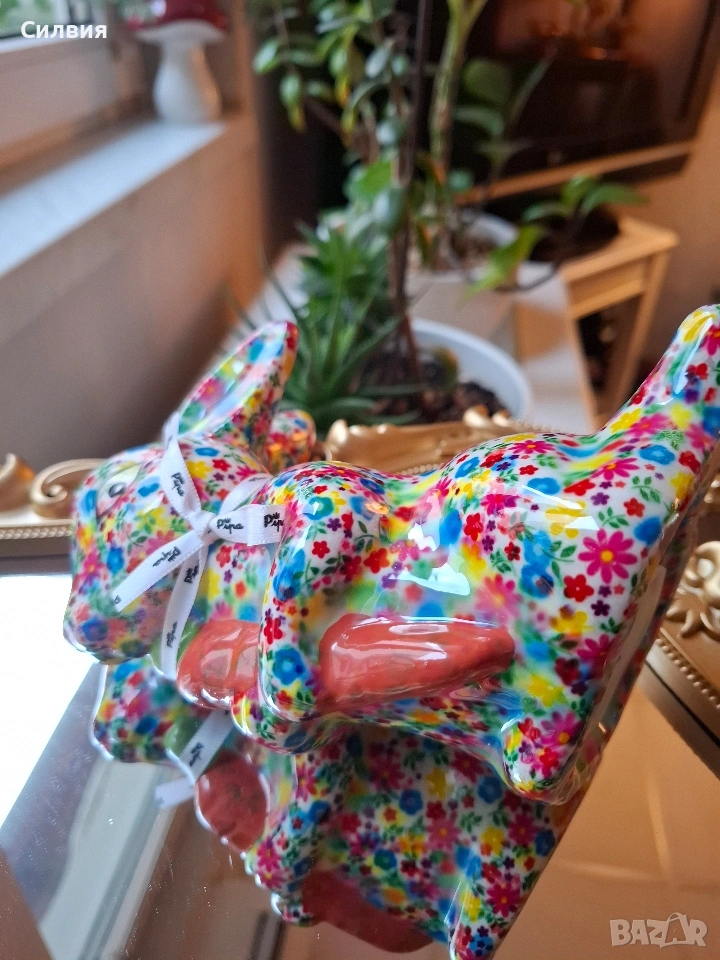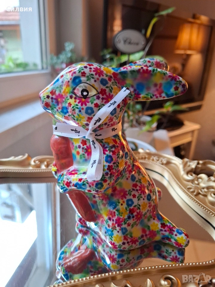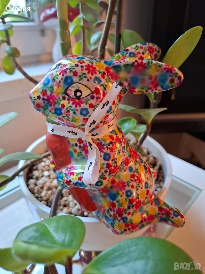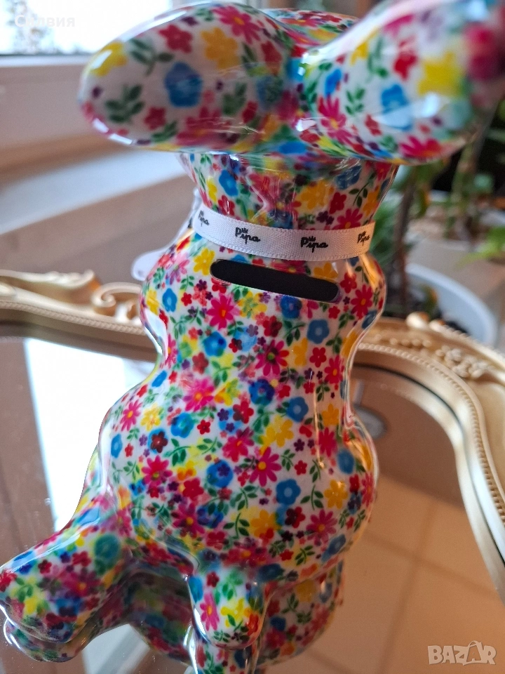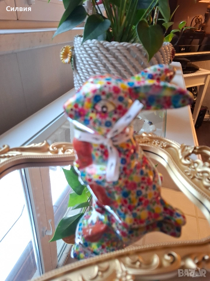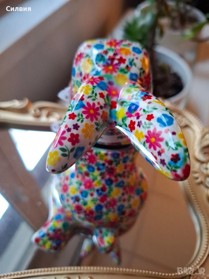 Искате да започнете да спестявате с усмивка? Тази керамична касичка във формата на весело зайче е не само практичен елемент, но и оригинална декорация и чудесна идея за подарък. Тя ще се превърне във вашия ежедневен мотиватор за спестяване на пари – за почивки, мечти или за да научите детето си да спестява! Добавете щипка пролетно настроение и уют в дома си с тази красива и жизнерадостна касичка! Малко произведение на изкуството, което ще усмихне всеки интериор. Детайлно изработено зайче, държащо морков, изцяло декорирано с пъстър флорален десен. Ярките цветове и гланцовото покритие му придават изискан и свеж вид. Функционалност: Практична касичка с дискретен отвор на гърба за пускане на монети и гумена тапа на дъното за лесно изваждане на спестяванията. Размер: Височина приблизително 15 см – перфектният размер за етажерка, нощно шкафче или бюро. Внася цвят и антикварен чар в хола или детската стая. Прекрасен избор за Великден или просто като мил жест за любим човек. Ценно допълнение за любителите на нестандартни и маркови керамични фигурки. Цена 1️⃣3️⃣€ 25,43лв ღꕥ⊱❥─❥⊱🥕✿⊱╮🥕☆♪ ░L░o░V░e░❥─❥⊱🥕✿⊱╮🥕☆♪ღღ꧂ღ
