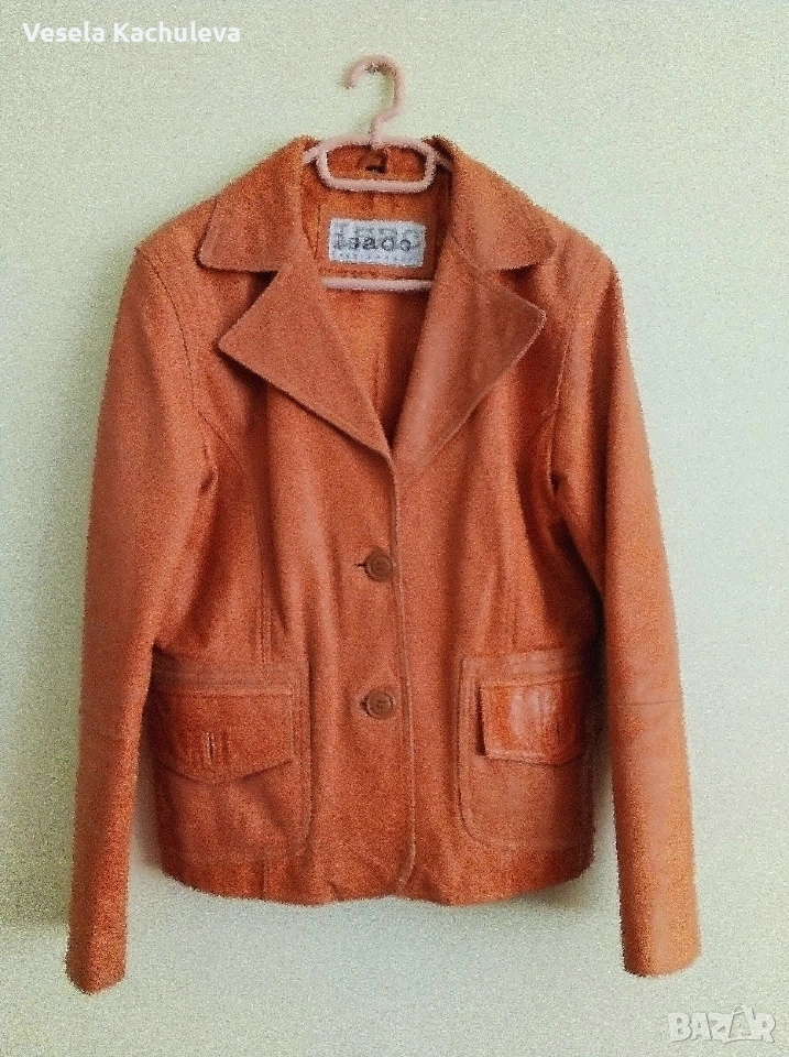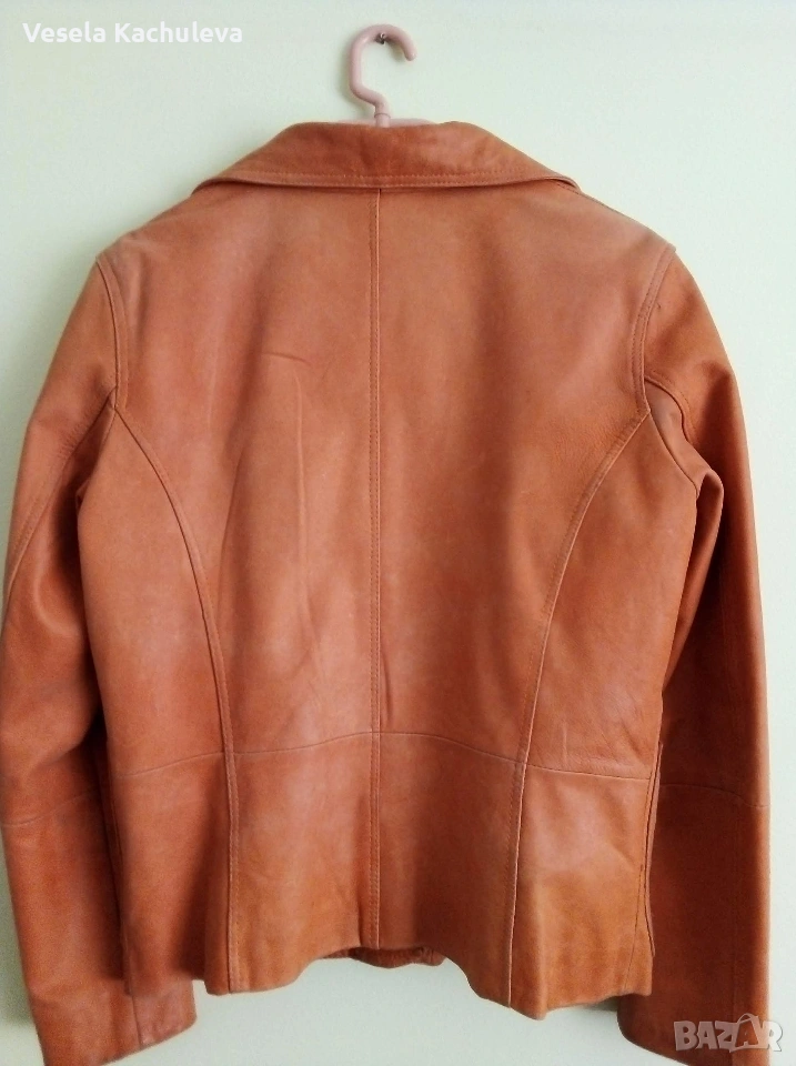 Продавам оранжево, дамско яке от естествена кожа, номер 46, гръдна обиколка 90см, дължина 60см, много добро състояние. Цена 19€(37лв.)
