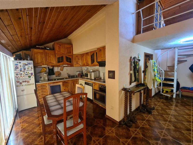 Вътрешно разпределение: първо ниво антре, хол всекидневна с кухненски бокс с излаз към просторна тераса, родителска спалня с излаз към тераса, санитарен възел, вътрешни стълби разположени в антрето които водят към второ ниво където е разположено всекидневно помещение и детска стая . Състоянието на имота е много добро, масивно строителство, добре поддържани общи части. Подовата настилка е терекот и естествен паркет във второто ниво, таваните са с дървена ламперия, стените са с латексова боя. Продава се с обзавеждането и оборудването което се вижда на снимките. Имотът се продава с дворно място от 60 кв,м. с масивна тухлена постройка - склад 20 кв.м. Сградата е санирана , не разполага с асансьор. В близост има училище, супермаркет, аптека, кафене, фризьорски салон, магазини и други търговски обекти. Достъпът до центъра на града се осъществява бързо и удобно. Офертата е подходящи за инвестиция с цел отдаване под наем.