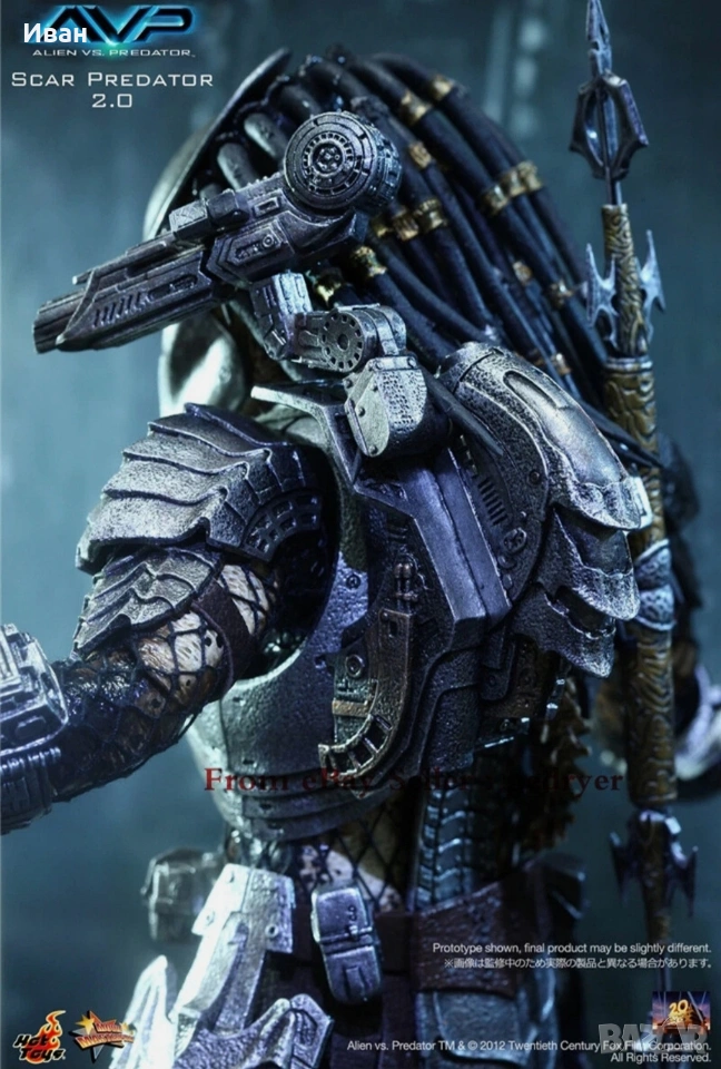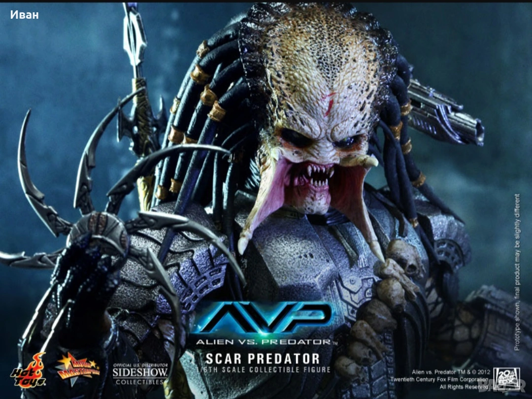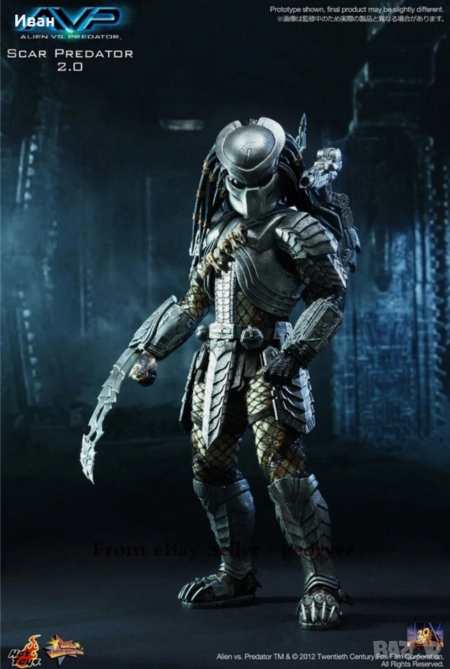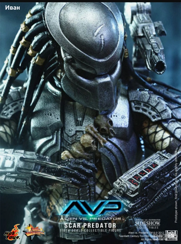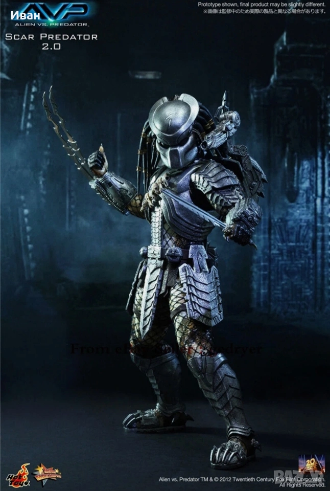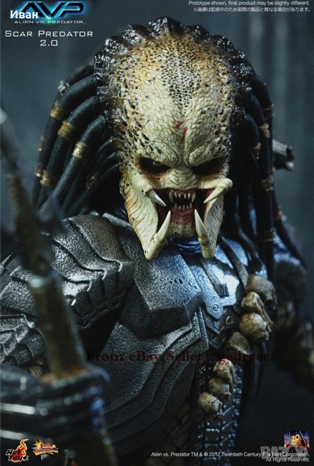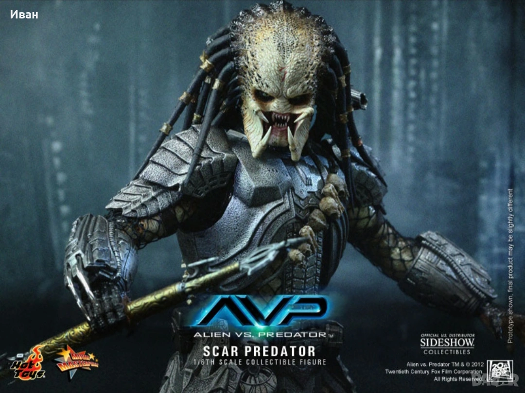 The 1/6th scale Scar Predator Collectible Figure specially features: - Authentic and detailed fully realized likeness of Scar Predator in the Alien vs. Predator movie - Realistic and accurate 1/6th scale of approximately 14 inches/ 35 cm tall - Over 22 points of articulations - Newly developed head sculpt and thighs - Net on body and left & right arms - One (1) exchangeable expanded mouth - Six (6) pieces of interchangeable palms including: One (1) pair of fists One (1) pair of open palms One (1) right palm for holding spear or shuriken One (1) left palm for holding dagger Weapons: - One (1) articulated shoulder cannon - One (1) extendable spear - One (1) metal dagger with sheath - One (1) shuriken - One (1) shuriken with blades Accessories: - One (1) detachable face mask with LED light-up function - One (1) pair of forearm armor with six (6) interchangeable wrist metal blades of different lengths on the right and self-destruct device on the left - One (1) chest armor and back armor - One (1) shoulder armor with straps - One (1) pair of thigh armor - One (1) pair of leg armor - Leather-like skirt with waist band - One (1) figure stand Artists: - Figure Sculpted by Joseph Tsang - Figure Painted by Joseph Tsang