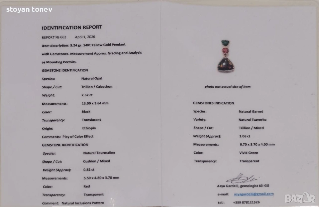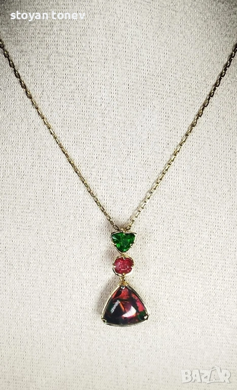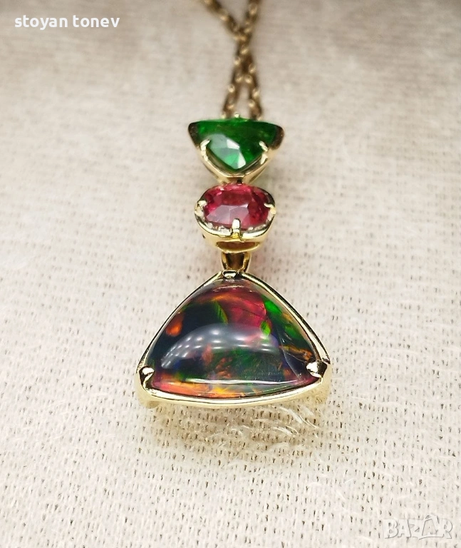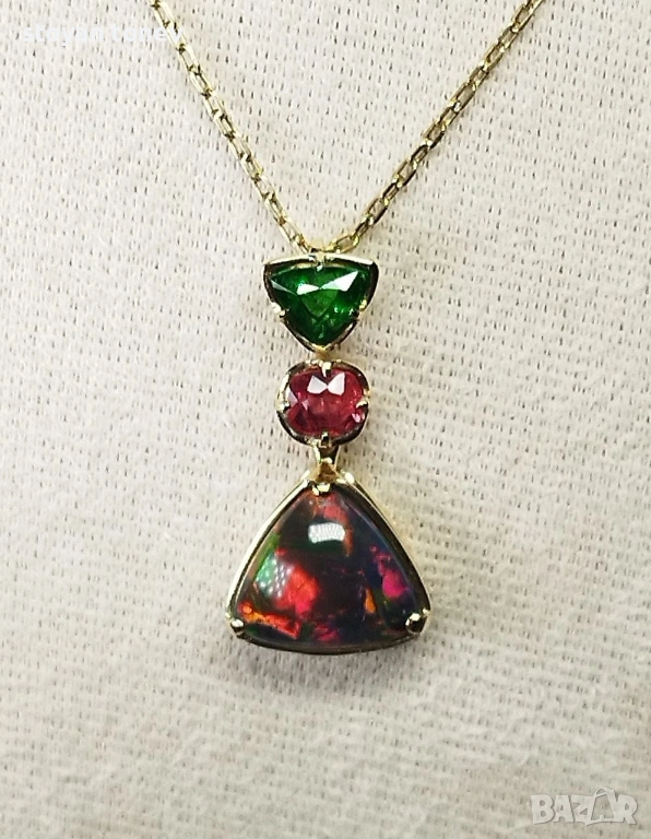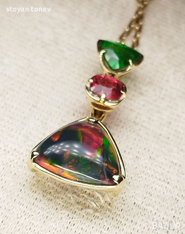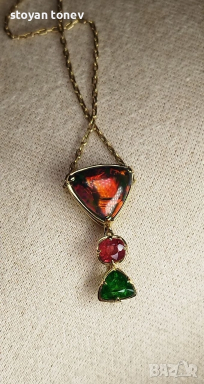 Медальонът е реверсивен – обърни го и получаваш напълно различен вид и настроение. Днес – по-драматичен и огнен, утре – свеж и цветен. Верижката (14K злато, 60 см, 4.00 гр, нова) се продава отделно. Сертифициран от IGI гемолог.