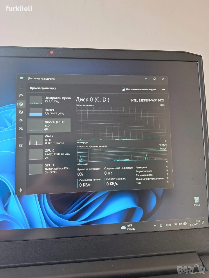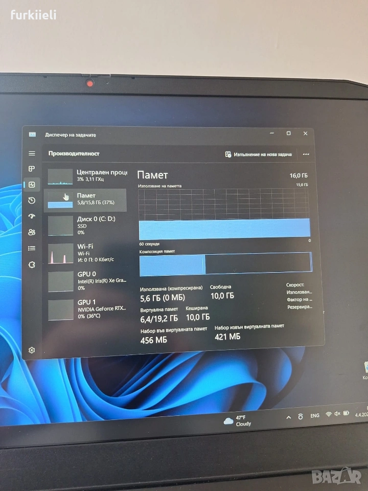 Предлага се с оригинално зарядно и кутия ,в перфектно състояние без следи от употреба Характеристики: Intel i5 11300H 3.1G 512GB SSD RAM:16GB DDR4 Display 15.6 FHD GPU RTX3050