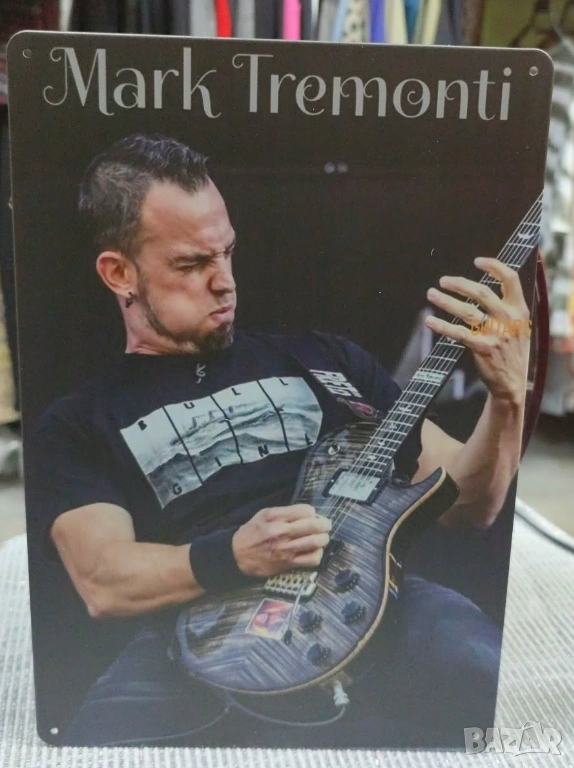 метална табела нa Mark Tremonti с неговата PRS в екшън позиция на сцената