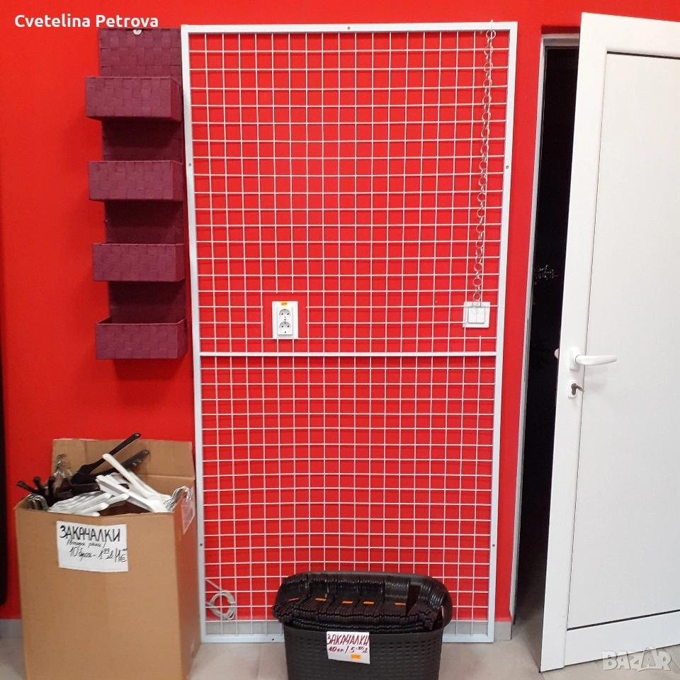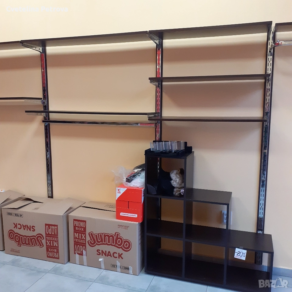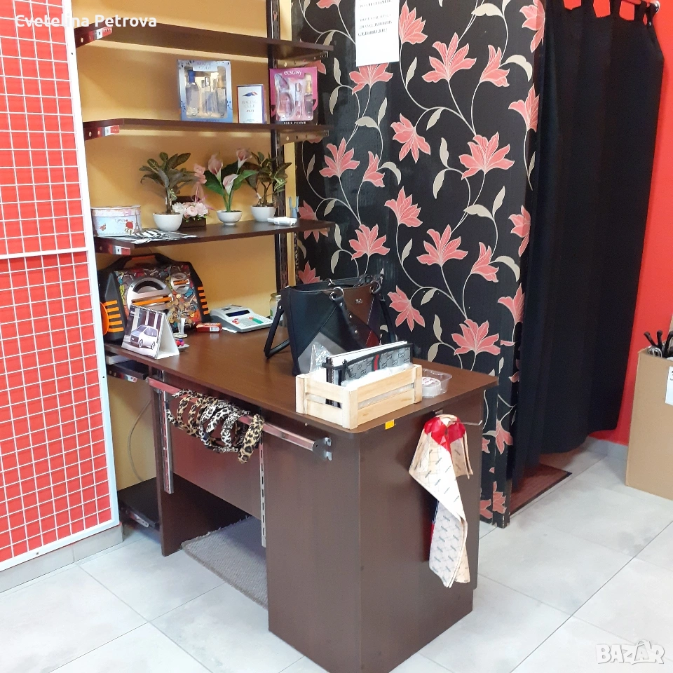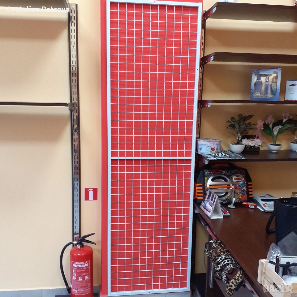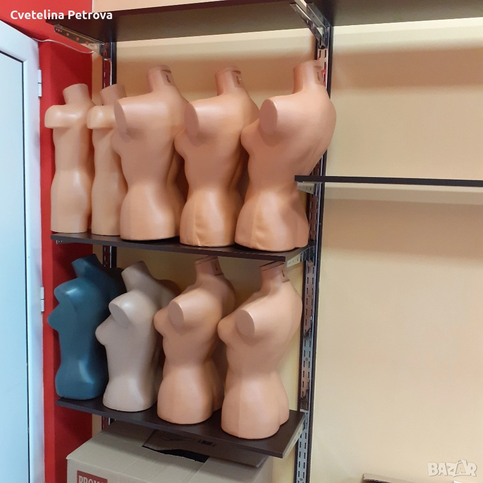 Оборудването включва: колони, рафтове/90 и 120см/, дамски цял манекен с перука/ дълга коса/ на стъклена стойка, крака, торсове/ мъжки, дамски, детски/, глави, мрежи за стена с множество куки за аксесоари, голям устойчив щендер стъкло, стойки за бижута, чанти, ръкавици, пожарогасител, множество пластмасови устойчиви закачалки и метални такива за панталони и поли. Състояние - като ново, изключително запазено! Ползвано 2 години в бутик за дрехи. Може да се разпродава и на части, с уговорка за цена. Лично предаване.