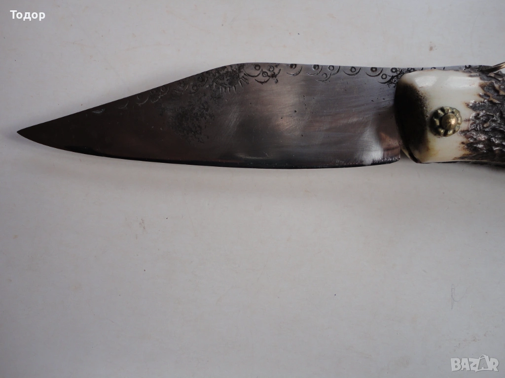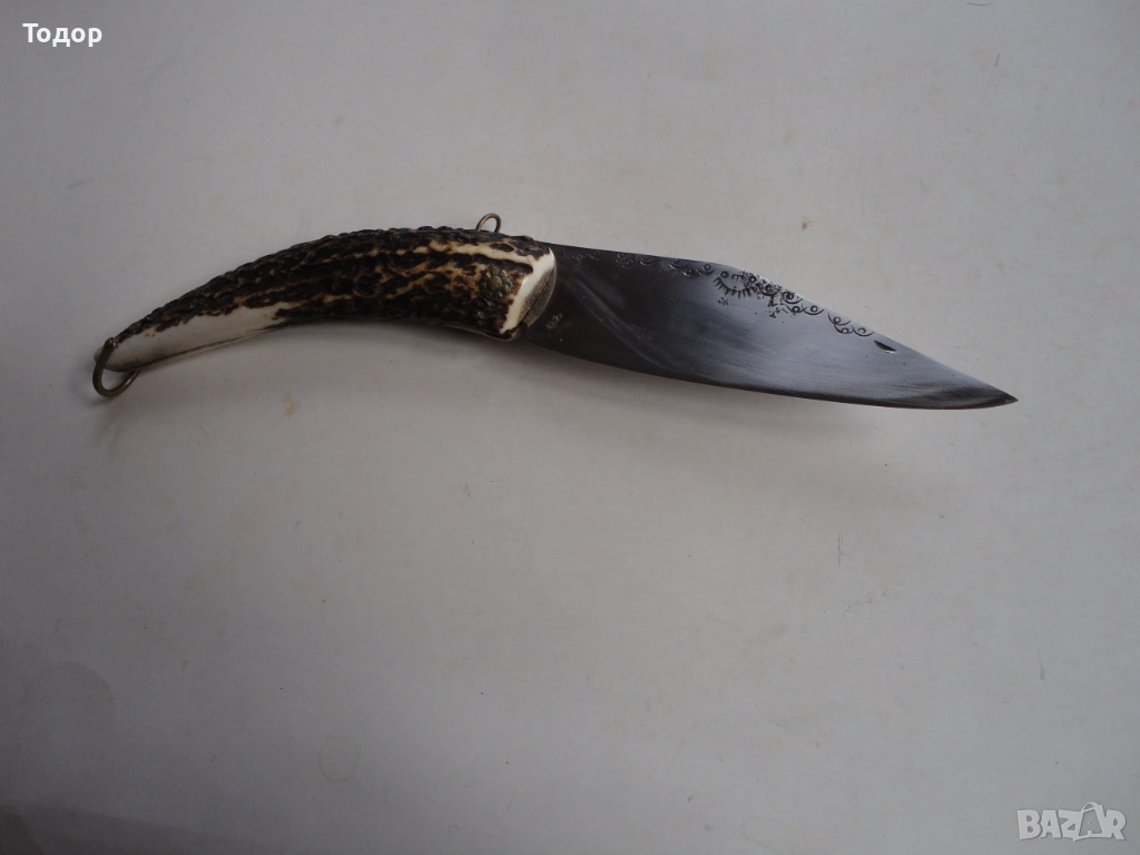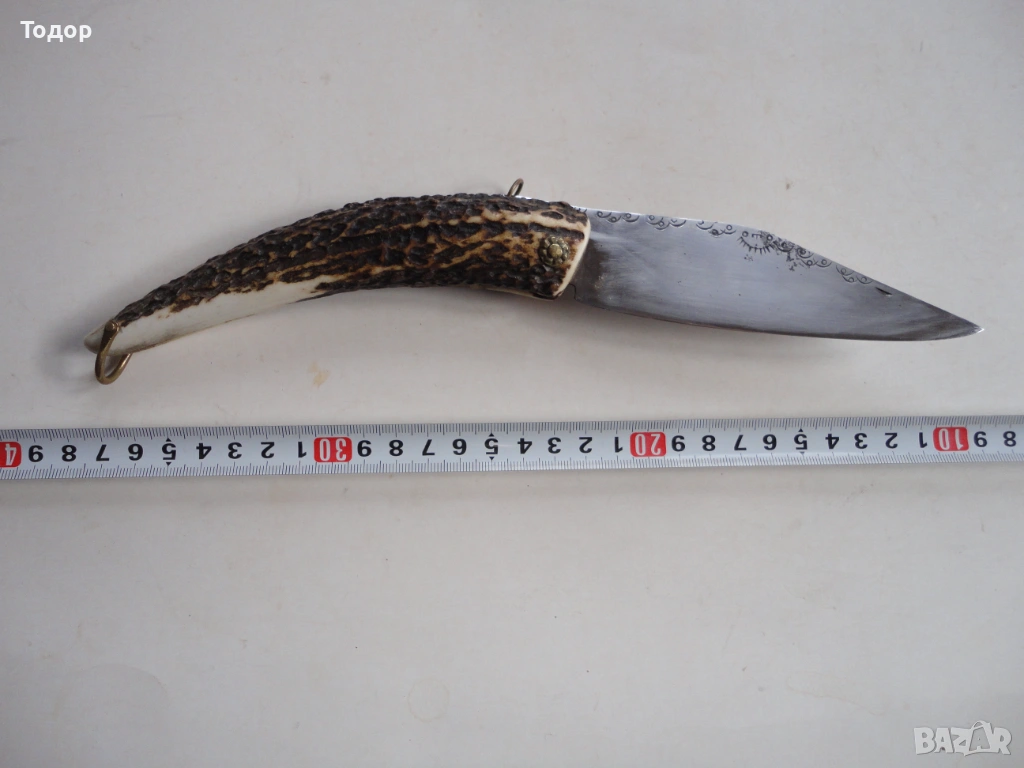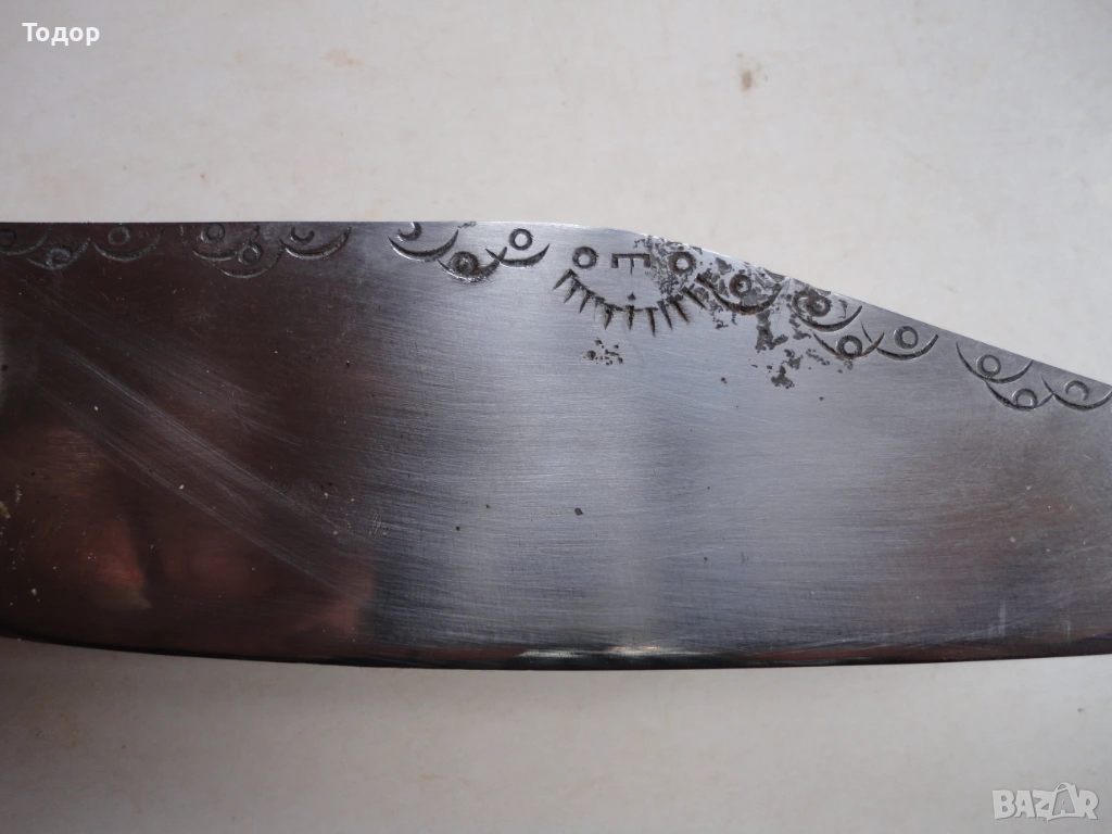 Страхотна изработка на майстора ножар Тодор Димитров баща на майстора ножар Бай Добри Дължина 28 см Ширина 35 мм Острието е покрито от двете страни с гравюри Има и майсторски знак Дръжка рог Не ползван като нов Отлично състояние
