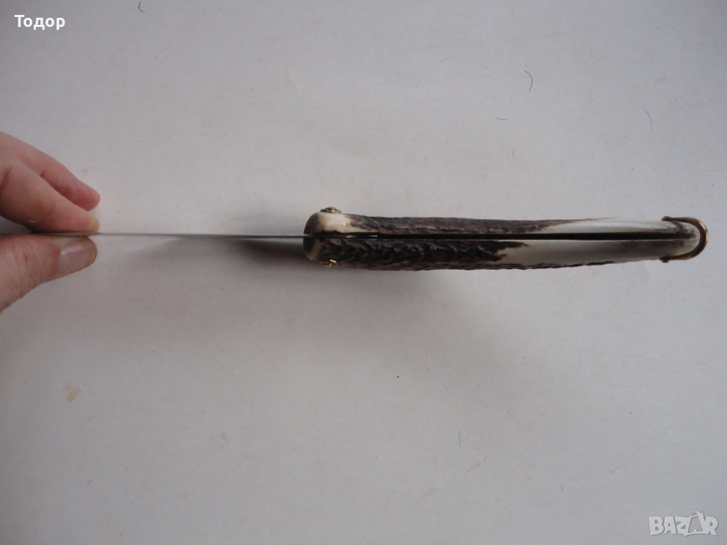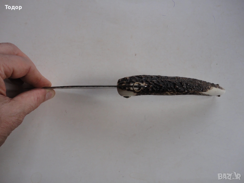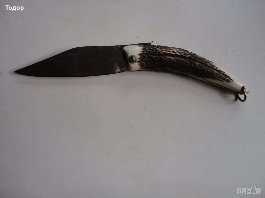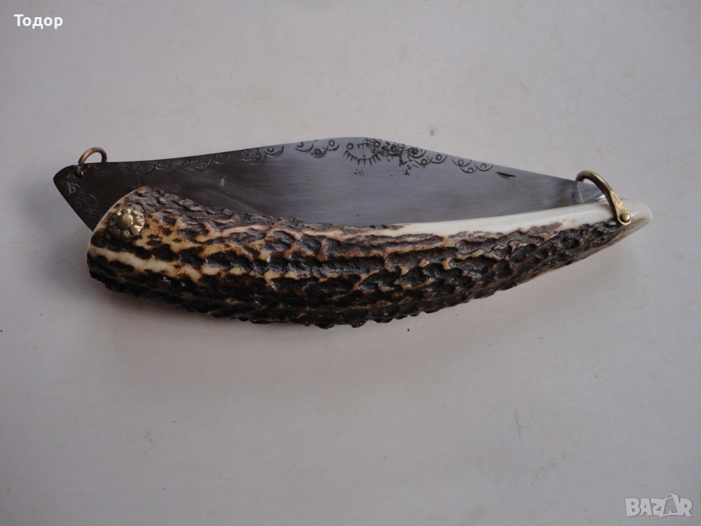 Страхотна изработка на майстора ножар Тодор Димитров баща на майстора ножар Бай Добри Дължина 28 см Ширина 35 мм Острието е покрито от двете страни с гравюри Има и майсторски знак Дръжка рог Не ползван като нов Отлично състояние