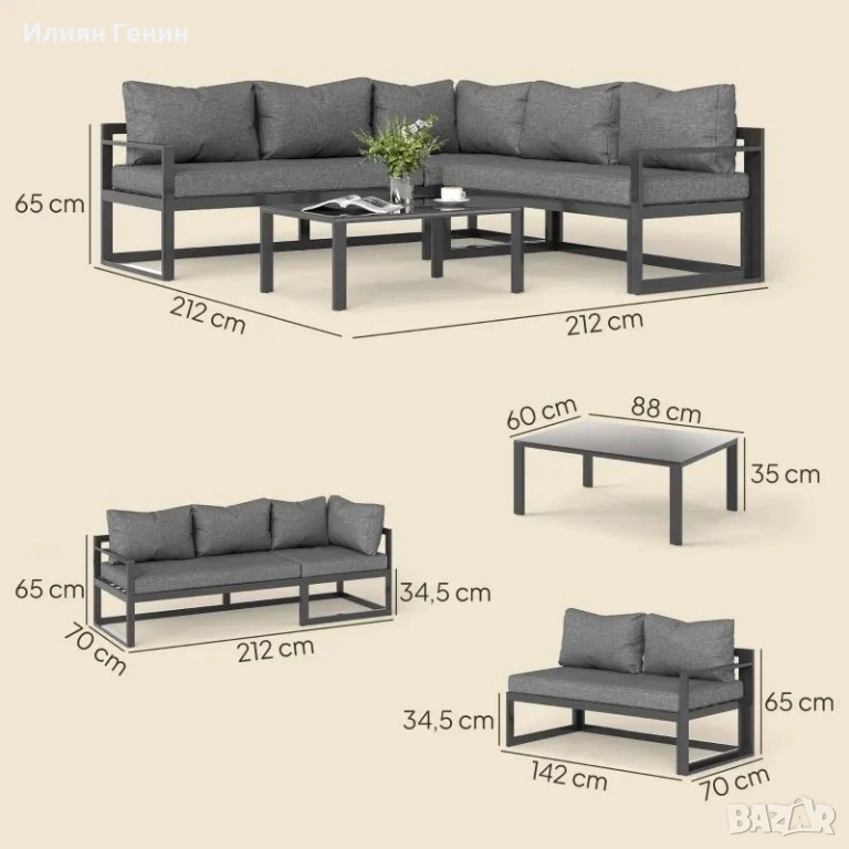 Здрава алуминиева рамка: Този комплект дивани е устойчив на ръжда и атмосферни влияния. Благодарение на лекия си дизайн, той е лесен за преместване – не е необходима помощ! Освежете декора на градината си и създайте нова атмосфера за партита, семейно време или тихи вечери.
