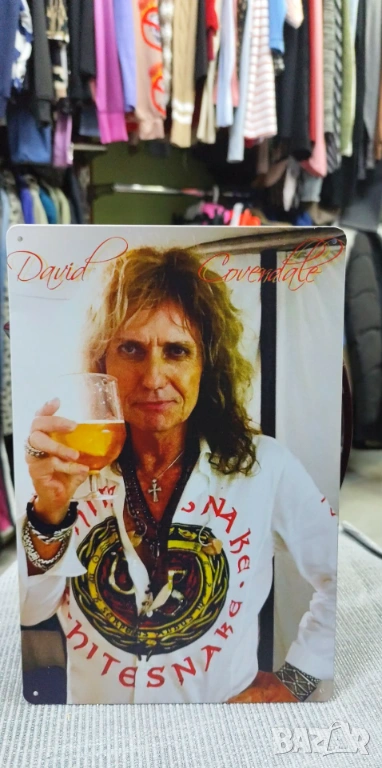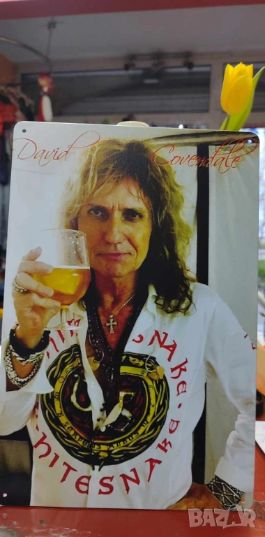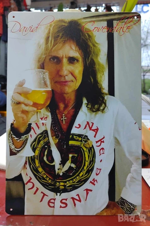 метална табела нa David Coverdale,пожелаващ Наздраве с бира в ръка