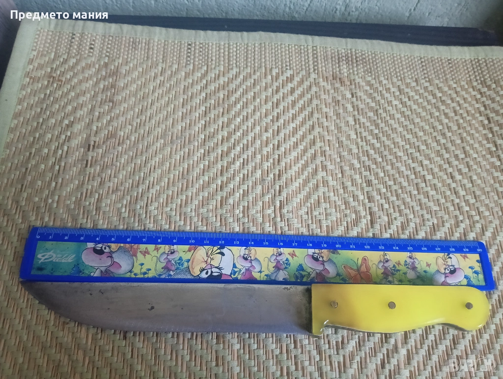 Размери: Обща дължина около 29-30 см (видимо на снимките с линията). Острието е приблизително 18 см.