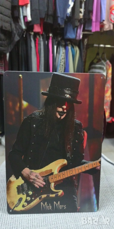 метална табела нa китариста на Motley Crue,уникалния Mick Mars с неговия реликнат signature Fender Stratocaster(една от китарите,които бих си купил,въпреки,че е много скъпа)