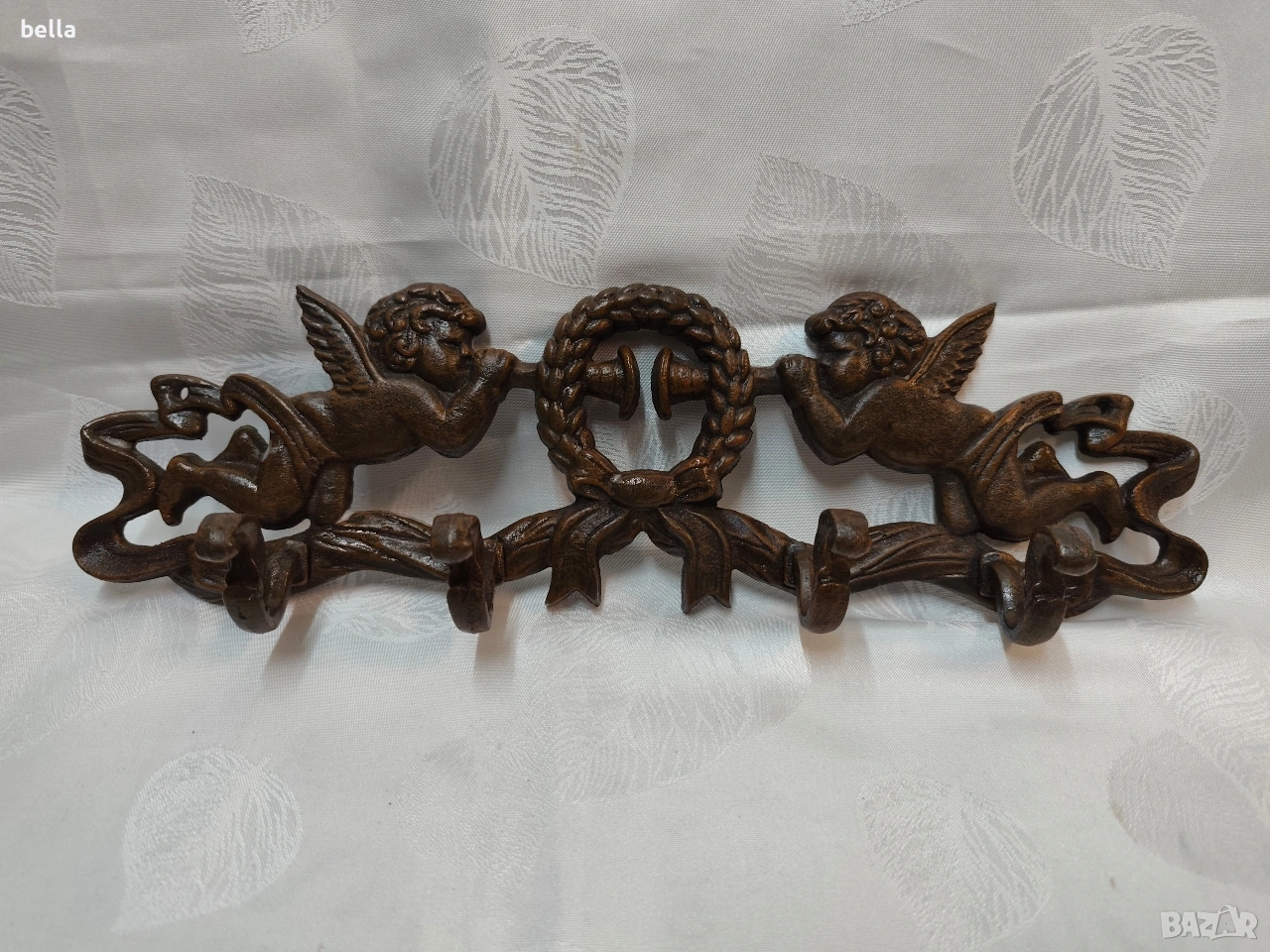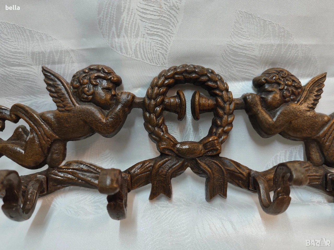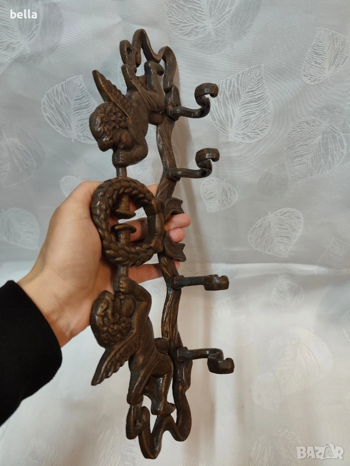 Ретро закачалка от масивен чугун – Бароков стил с ангели . Висококачествен лят чугун (тежък и изключително здрав). Детайлна барокова изработка с фигури на херувими (ангелчета), свирещи на тромпети, и централен лавров венец.Естествена антична патина в бронзов нюанс, която подчертава всеки релеф.Четири здрави куки, готови да издържат дори най-тежките зимни палта или аксесоари,дължина 37 см.Цена 85 евро