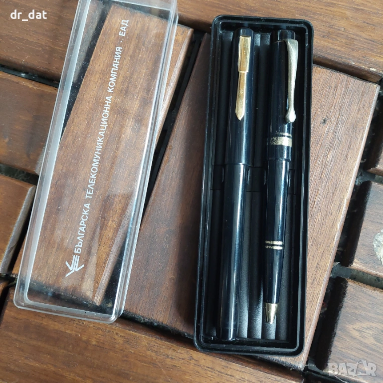 Време за пролетно почистване. Предлагам немска писалка в отлично състояние и позлатен писец Iridium point и тайванска химикалка. И на двете има щампи за произведени в Германия, съответно Тайван. В рекламна кутийка на БТК. Цената е пакетна и за двете с кутията.